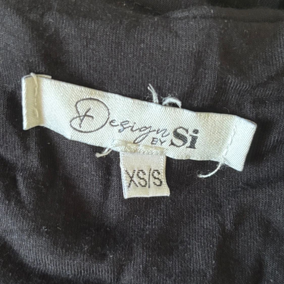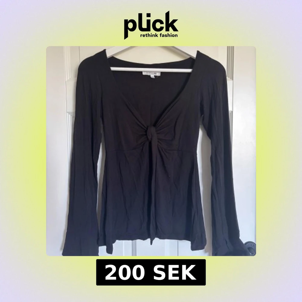 Svart långärmad topp från Design Si i mjuk bomull. Toppen har en snygg v-ringning och cool knyt-detalj framtill som ger en trendig look. Passformen är normal och ärmarna är långa med lätt utsvängd form. Perfekt för dig som gillar stilrena plagg med en twist. Den är använd en del men är fortfarande i super skick.