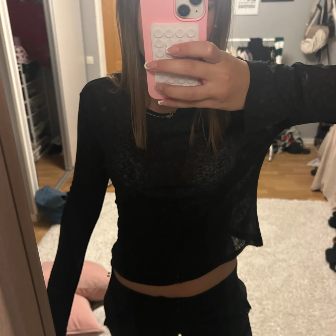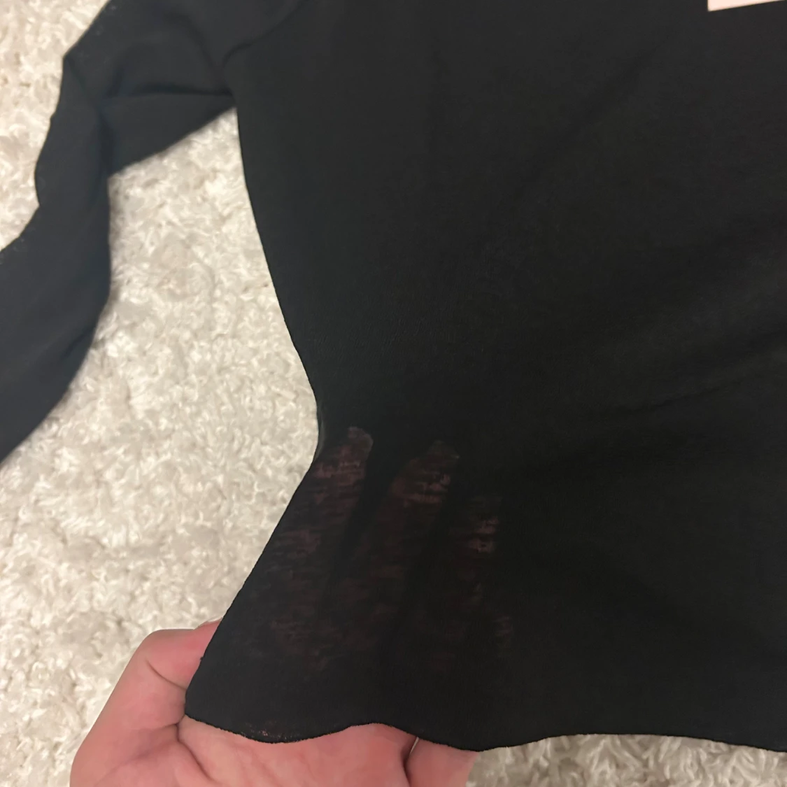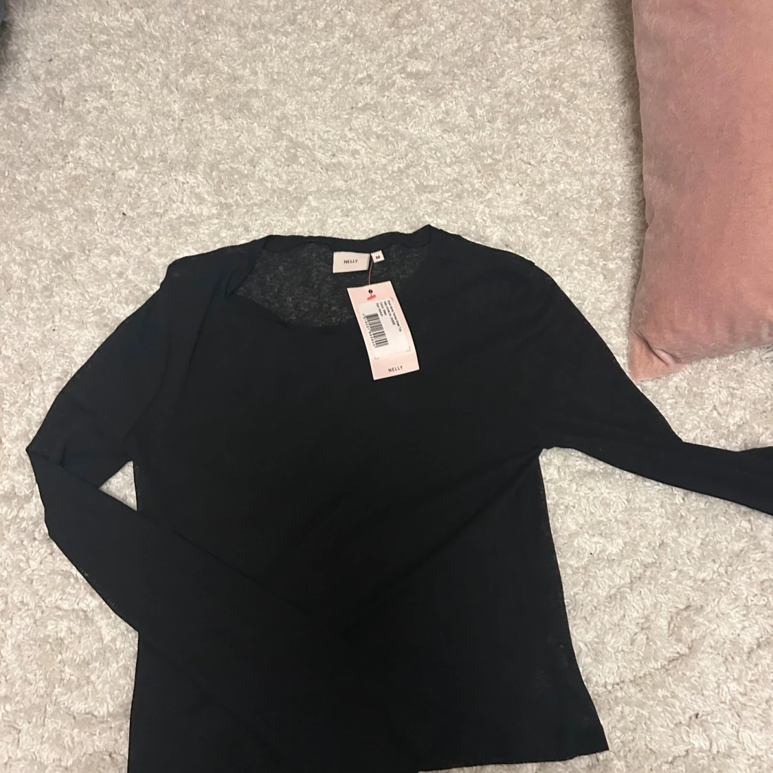Säljer en svart, tunn och lätt transparent långärmad topp från Nelly. Modellen är slim och har en enkel rund halsringning. Materialet är mjukt och stretchigt