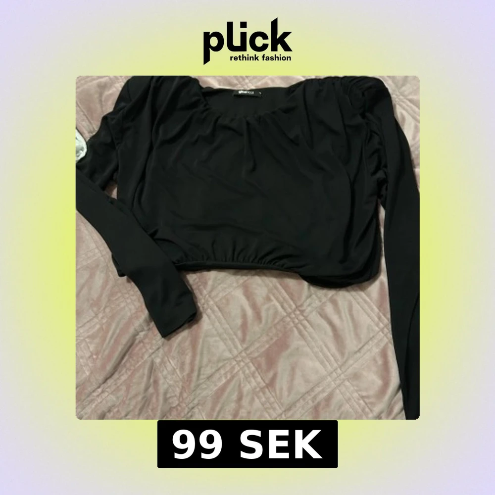Säljer en svart långärmad topp från Gina Tricot med croppad passform och lätt rynkade detaljer vid axlar och midja. Toppen har en rundad halsringning och är tillverkad i ett mjukt, stretchigt material som sitter snyggt på kroppen.
