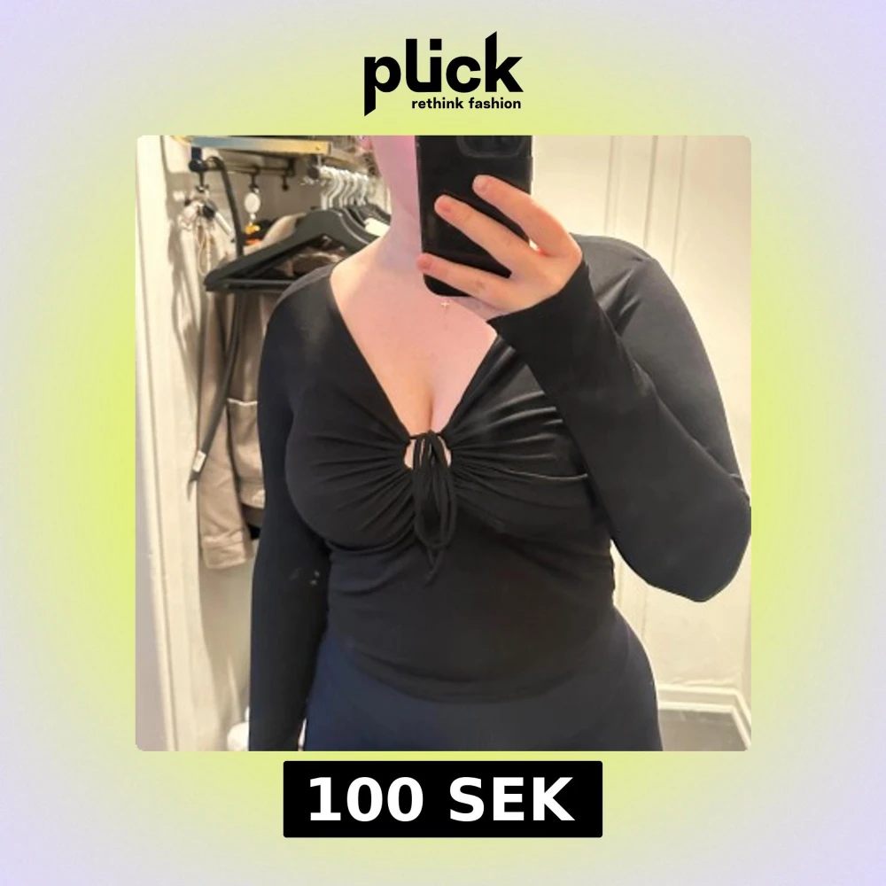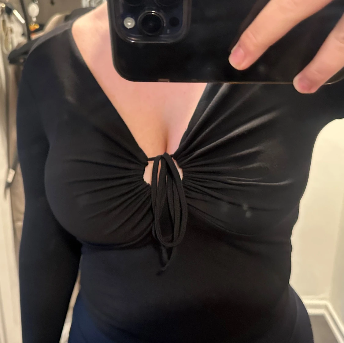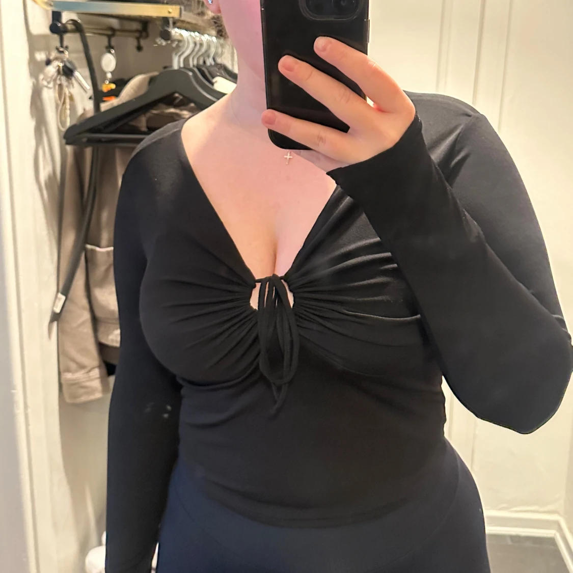 Säljer en svart långärmad topp med djup v-ringning och knytning framtill. Toppen är figurnära och stretchig, storlek M🫶🏼Aldrig använd