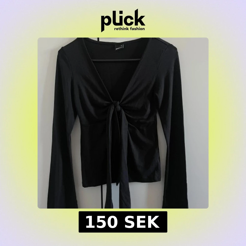 Snygg svart långärmad topp från Bershka med knyt framtill. Perfekt för en stilren look, passar både till jeans och kjol. Toppen har en v-ringad design som ger en elegant touch.