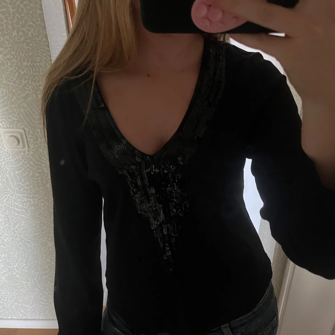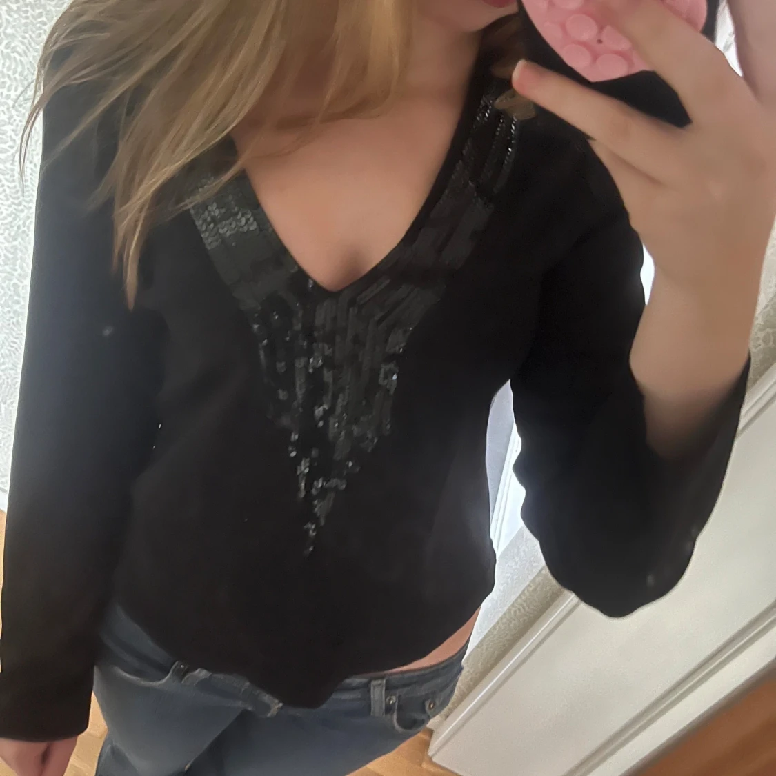 Säljer en svart långärmad topp med djup v-ringning och snygga svarta paljettdetaljer längs ringningen och framtill. Toppen har en figurnära passform. Materialet känns mjukt.