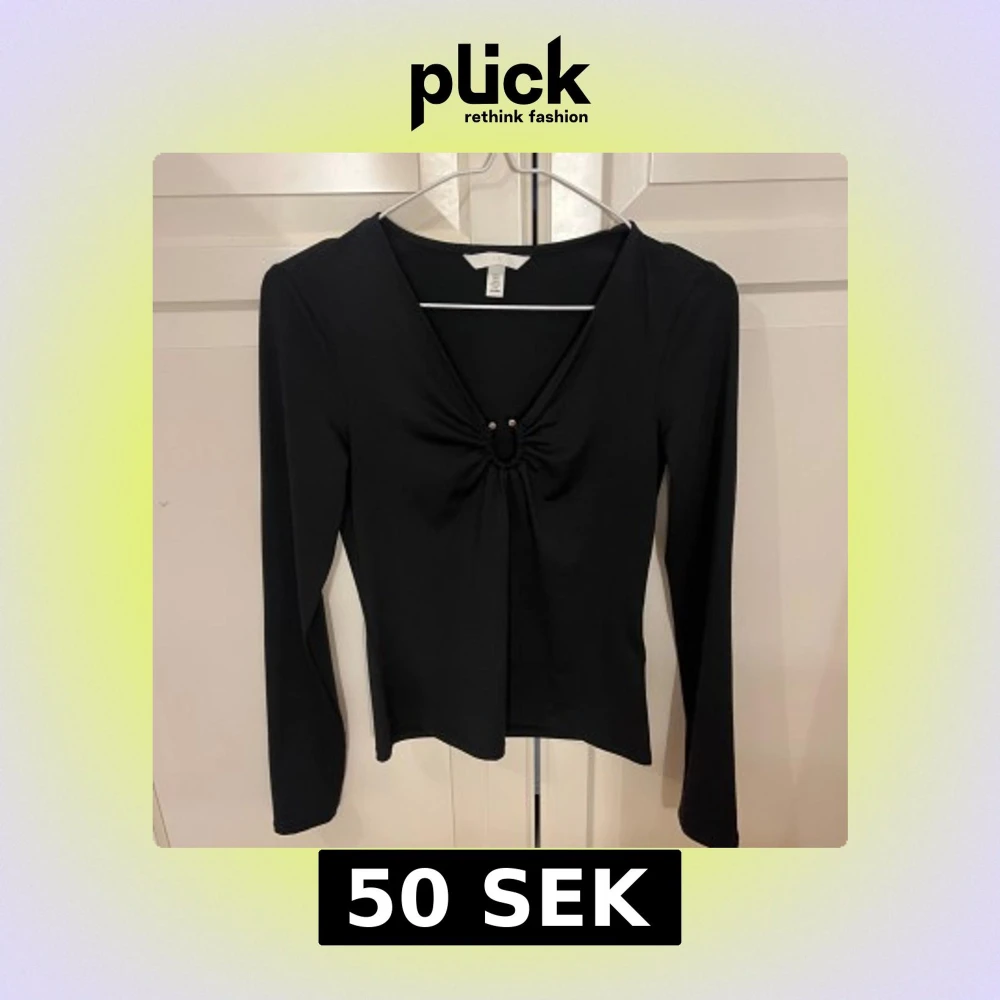 Svart långärmad topp från H&M med v-ringning och snygg ringdetalj framtill som ger en cool twist. Toppens material är mjukt och stretchigt, perfekt för att skapa en stilren look. Passformen är normal och toppen är enkel att matcha med olika outfits.