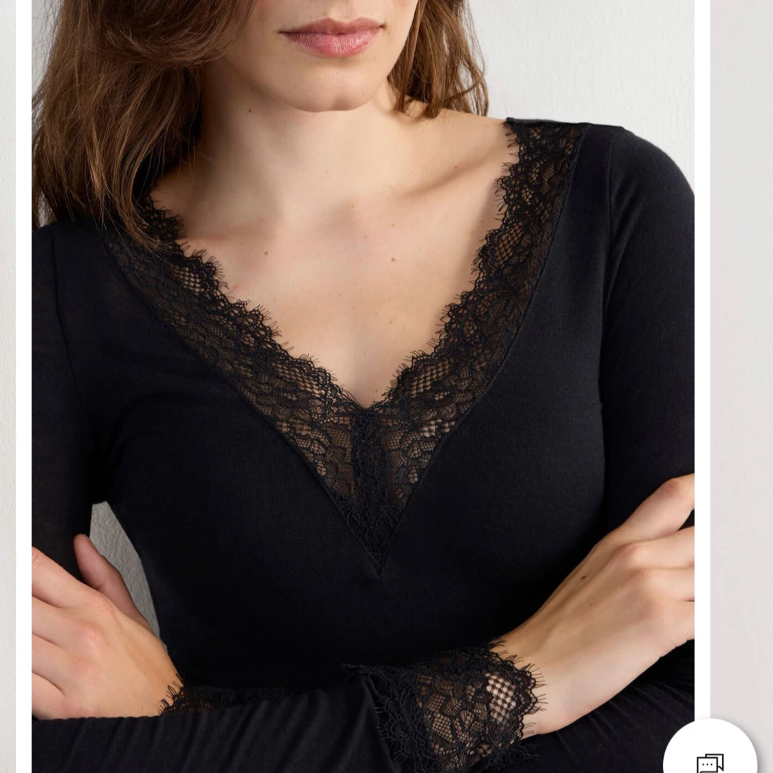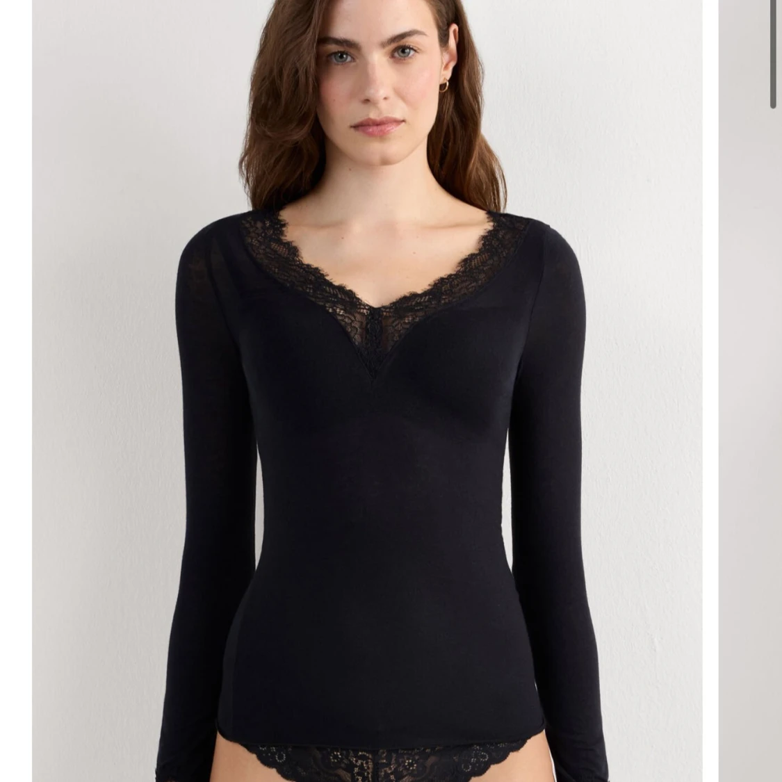 Svart långärmad topp med djup v-ringning och snygga spetsdetaljer vid halsringning och ärmslut. Figurnära passform som sitter snyggt på kroppen. Perfekt att styla med jeans eller kjol för en trendig look. Vill ni ha bilder på min egna är det bara o skriva