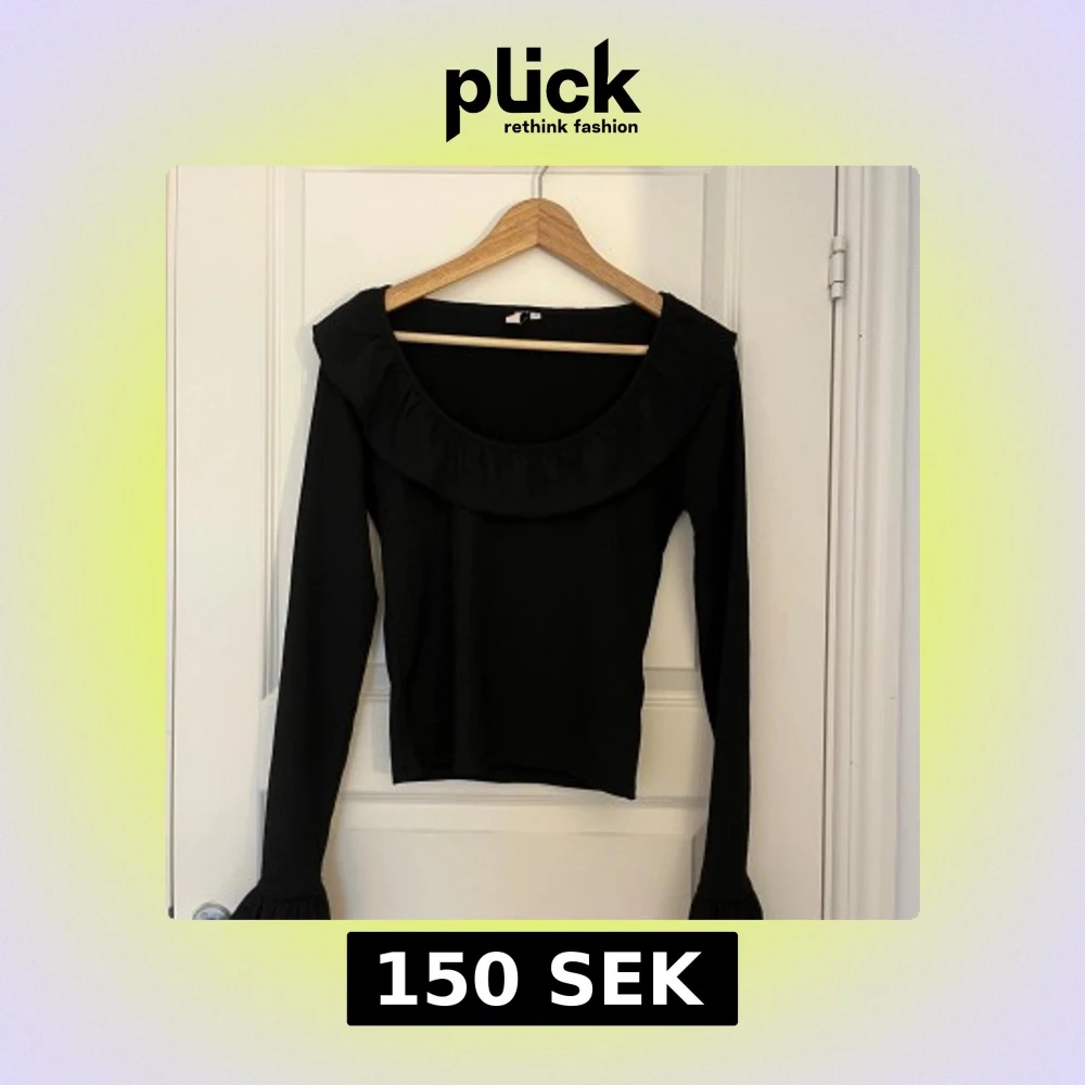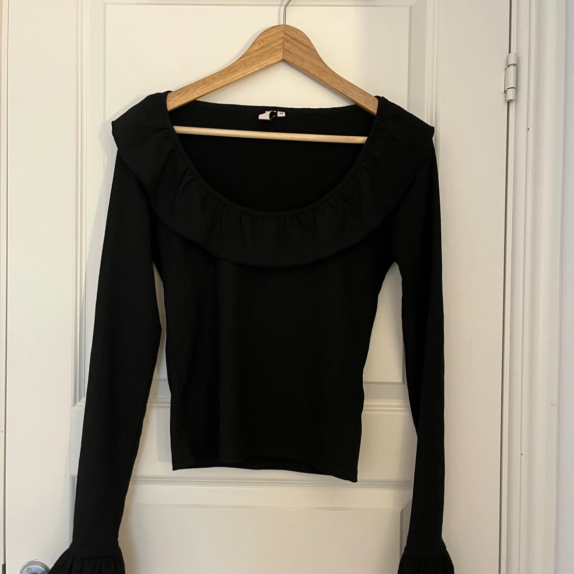 Svart långärmad topp med bred volang runt den djupa, runda ringningen. Toppen har en figurnära passform och är tillverkad i ett mjukt, stretchigt material. Perfekt för dig som gillar en stilren look med en twist. Endast testad.