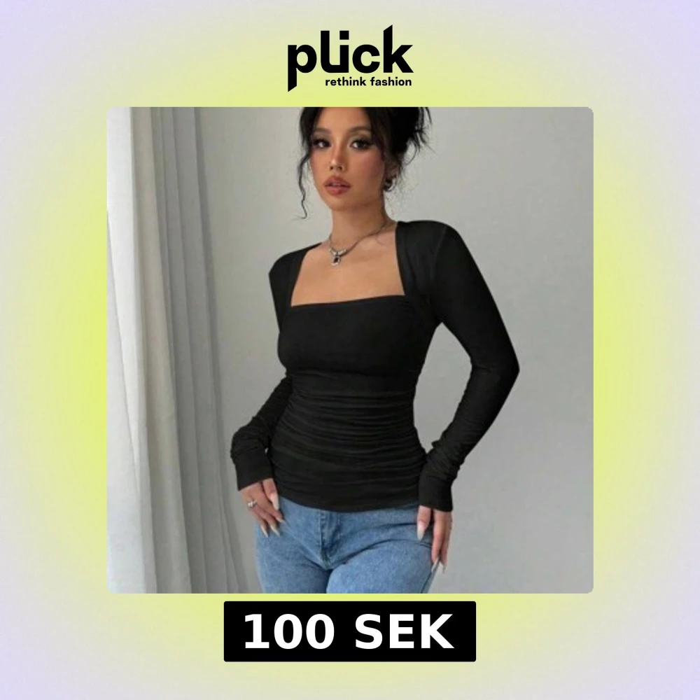 Svart långärmad topp med tight passform och snygg fyrkantig ringning. Toppen har rynkade detaljer längs sidorna och är tillverkad i ett stretchigt material som sitter skönt mot kroppen. Perfekt att styla med jeans eller kjol för en trendig look.