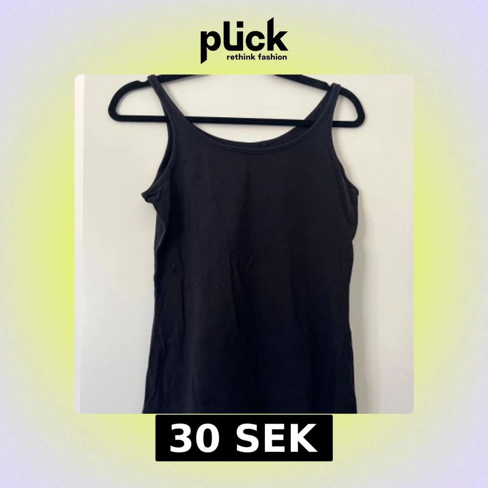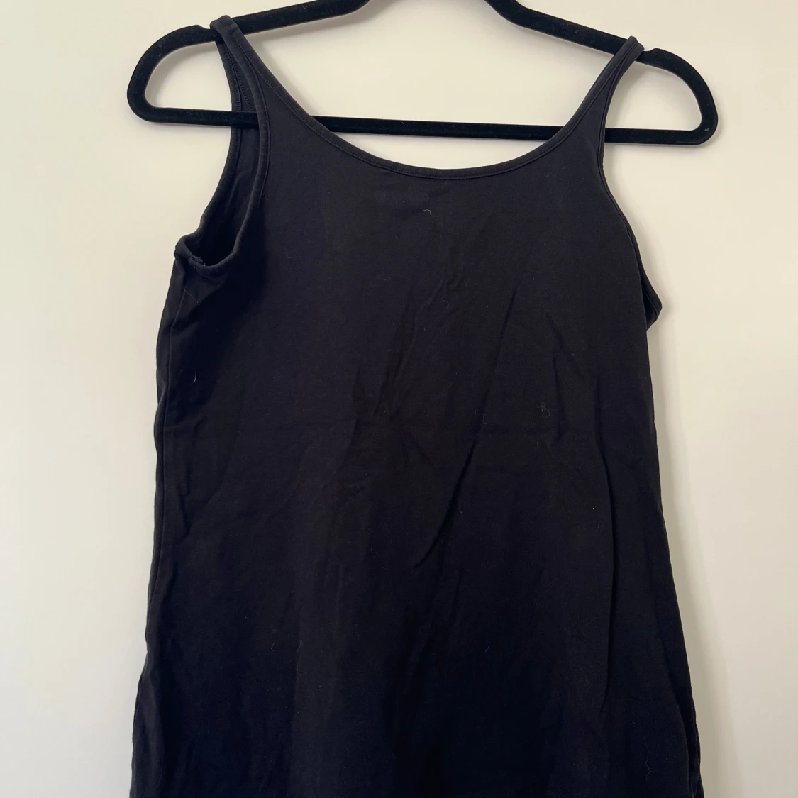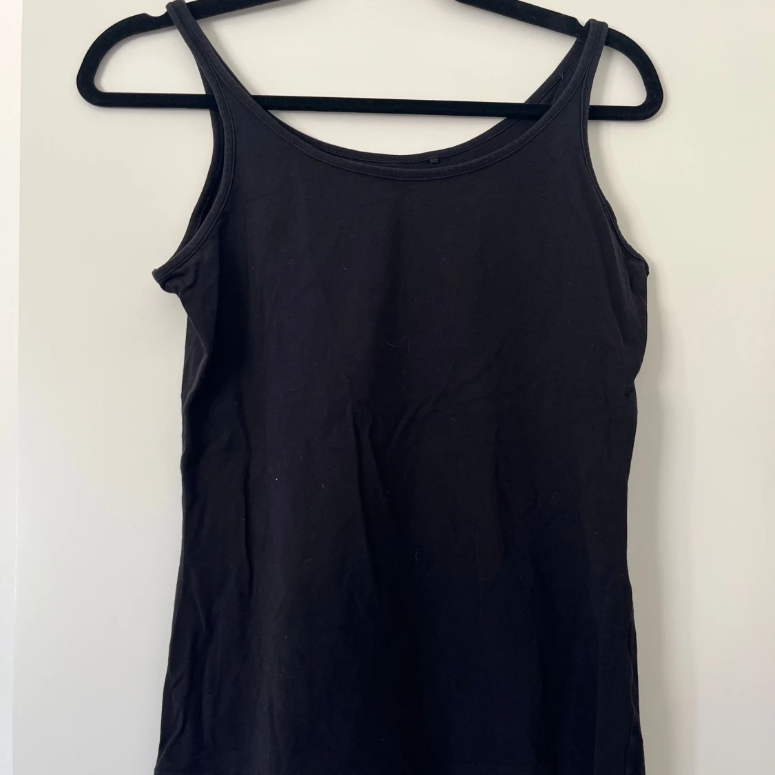Ett basic svart linne med smala axelband och rundad halsringning.