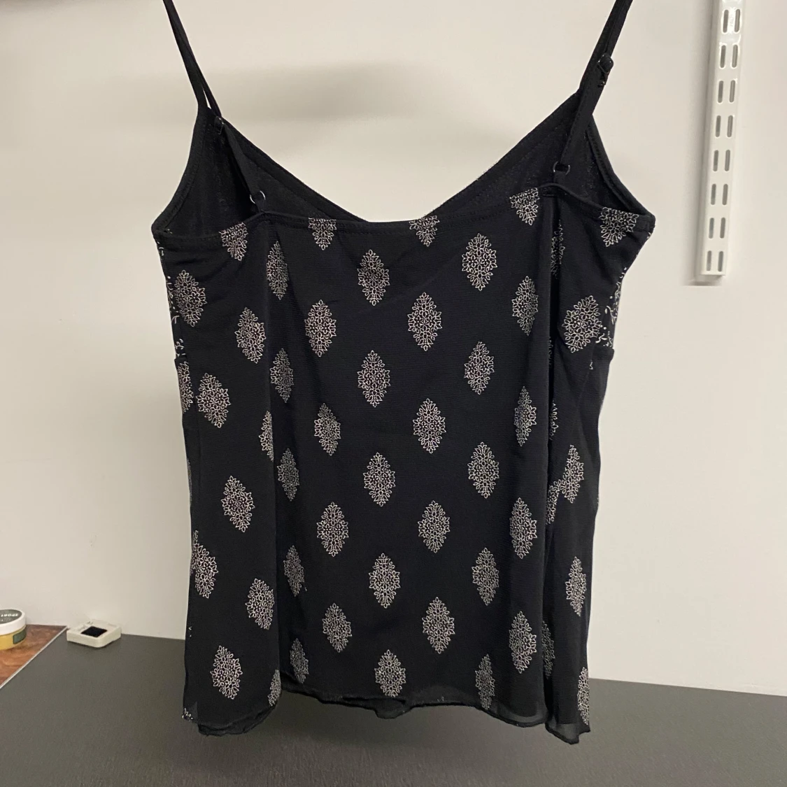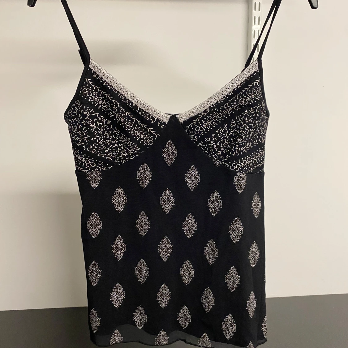 Snyggt svart linne med vita mönster och spetsdetaljer vid halsen. Perfekt för en cool look