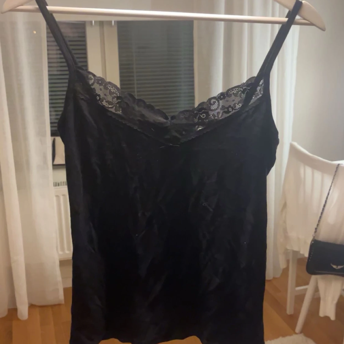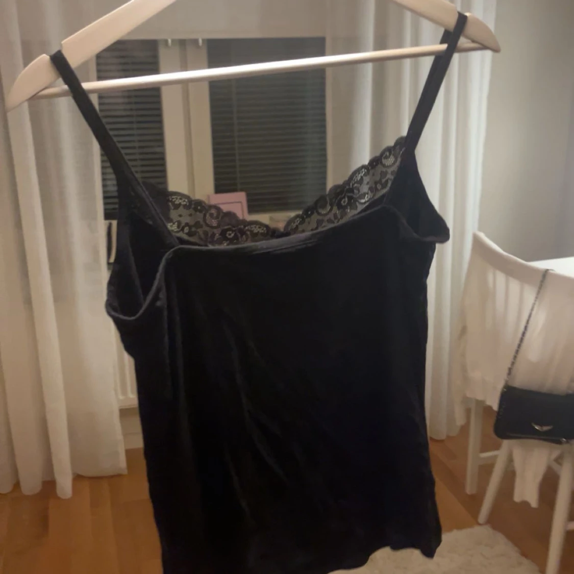 Supersnygg svart linnetopp i sammet från 157 med tunna axelband och spetsdetalj längs v-ringningen. Perfekt att styla med jeans eller kjol för en trendig look. Mjuk och glansig yta som ger en lyxig känsla.