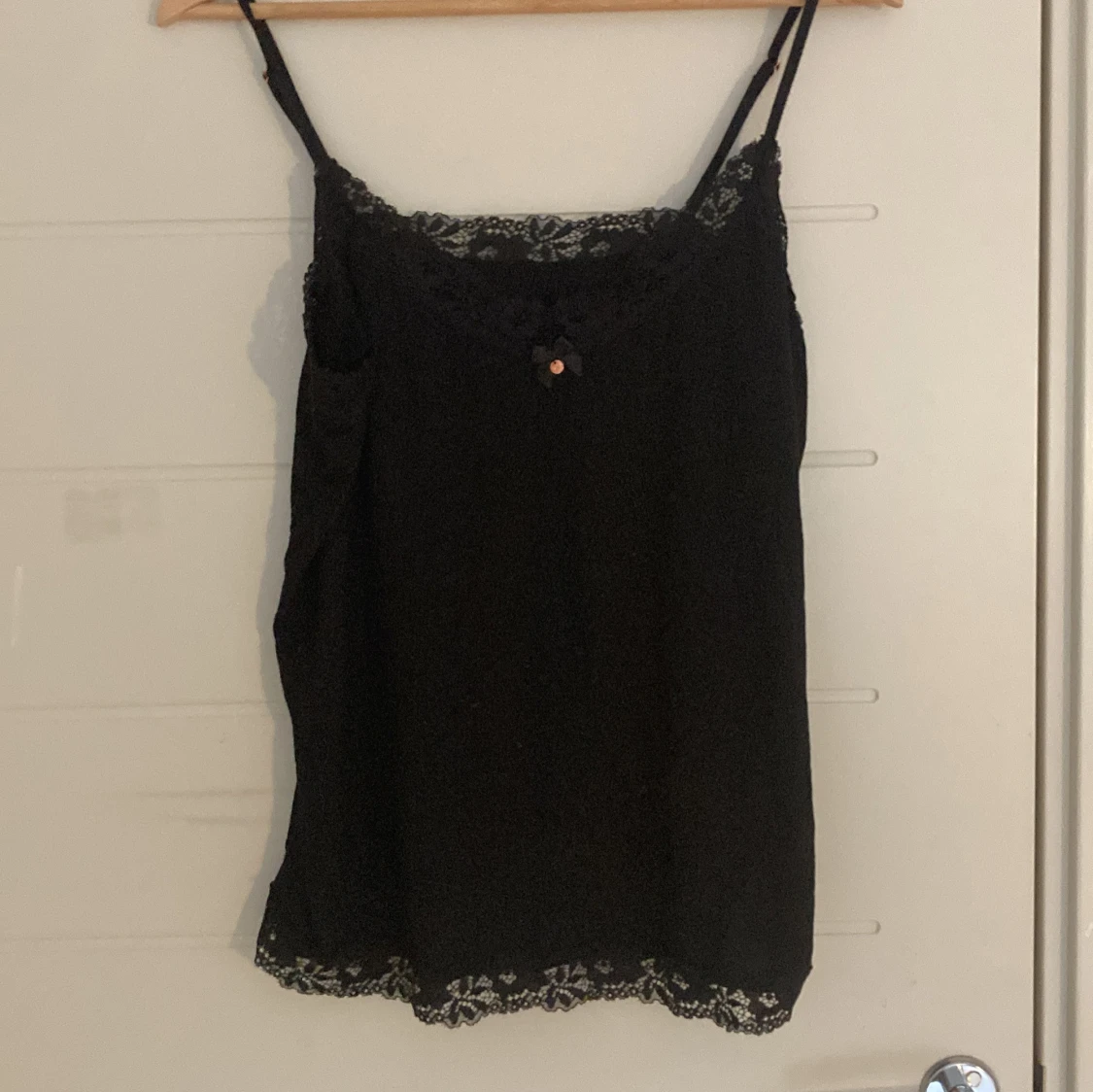 Säljer ett svart linne med spetskant vid halsringningen och nederkanten. Linnet har små detaljer i lite rosa/guld färg💗tryck gärna på köp nu, pris kan diskuteras💗💗