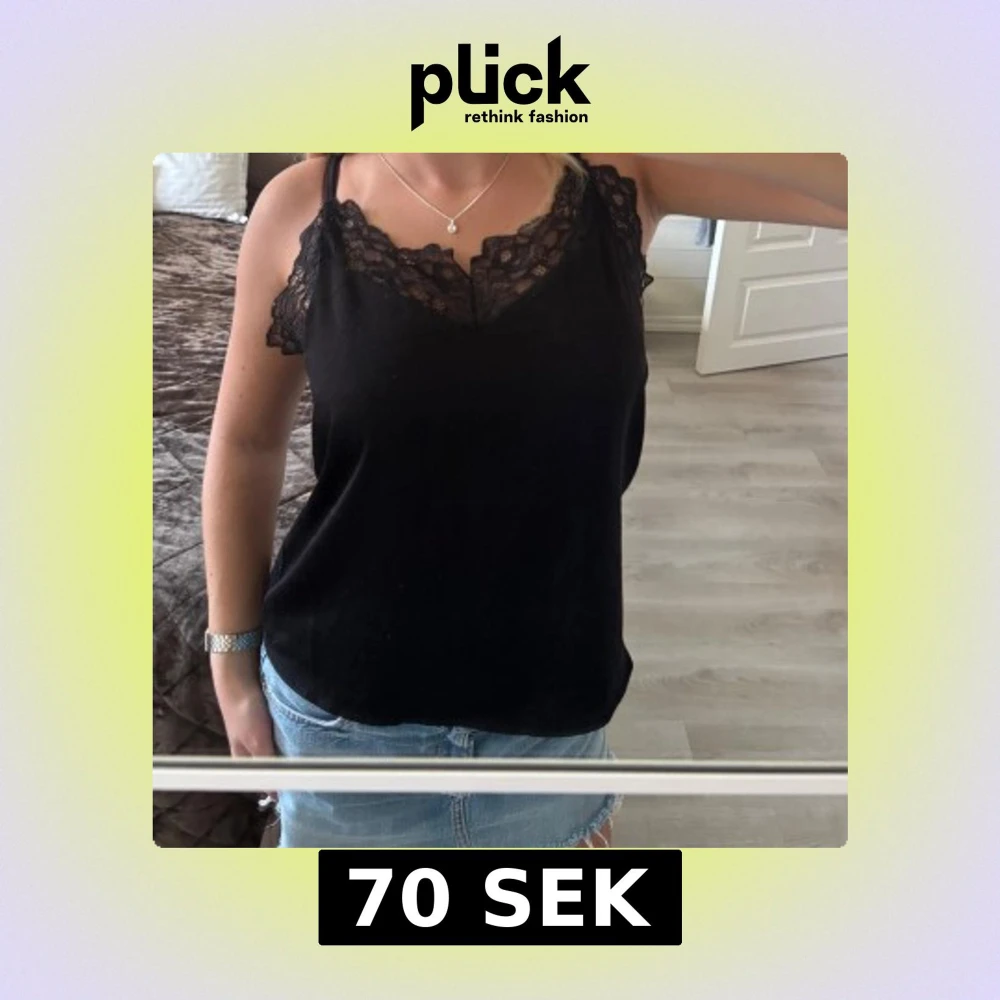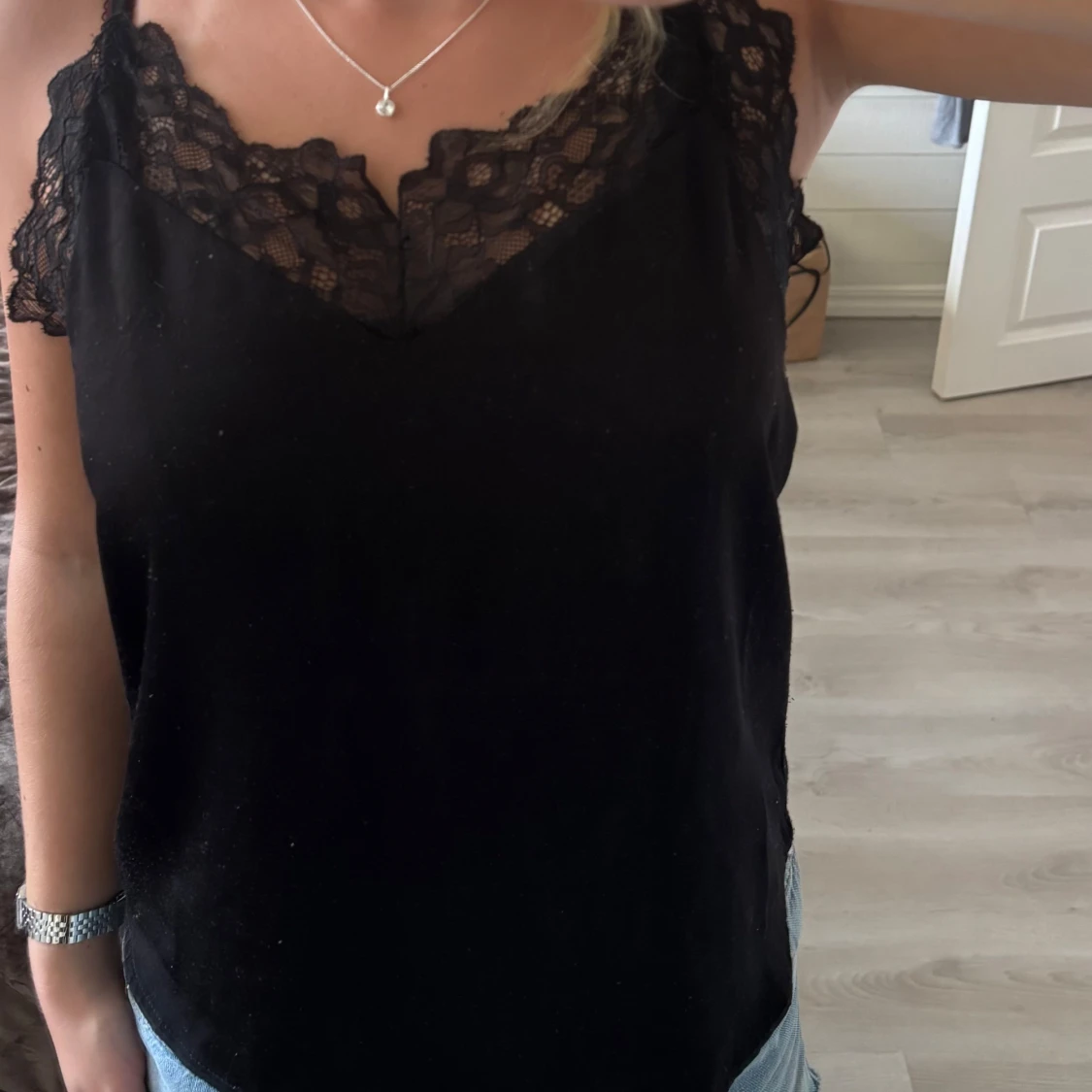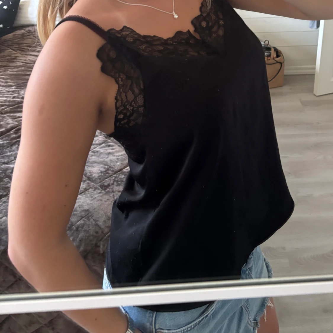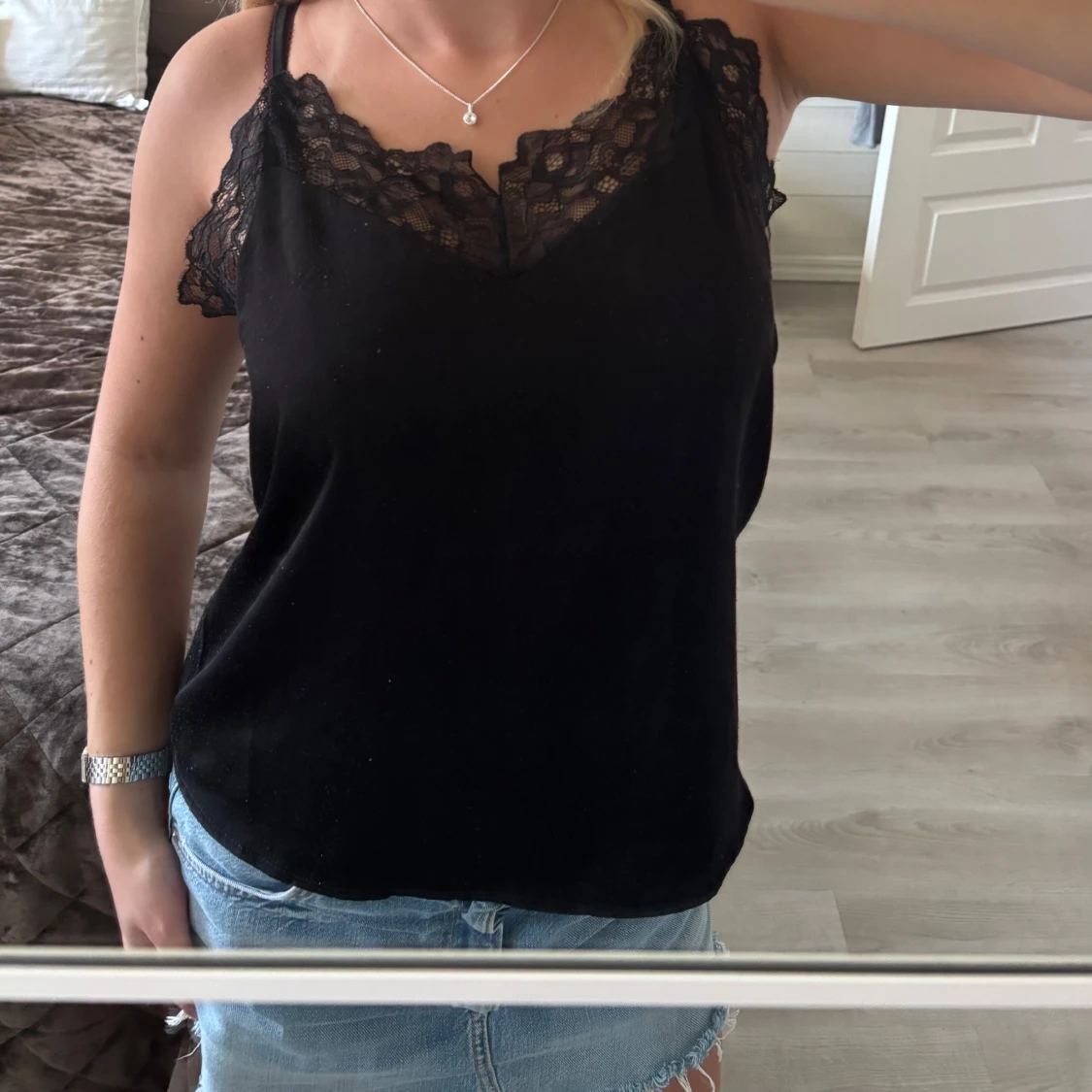 Snygg svart linne med tunna axelband och v-ringad hals från Only. Toppen har breda spetsdetaljer längs halsringningen och axlarna som ger en extra touch. Perfekt att matcha med jeans eller kjol. Det är lite nopprigt. Säljer då de inte längre kommer till användning💕