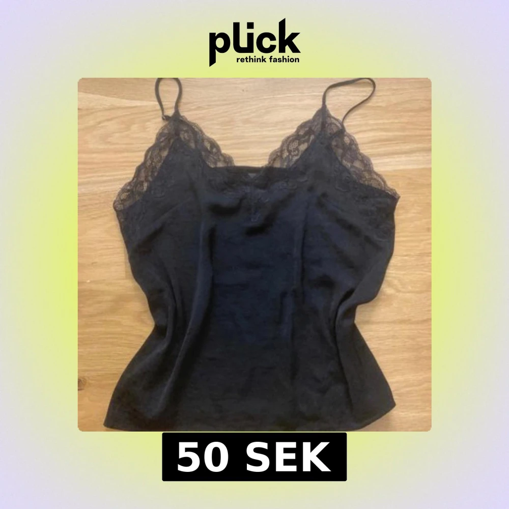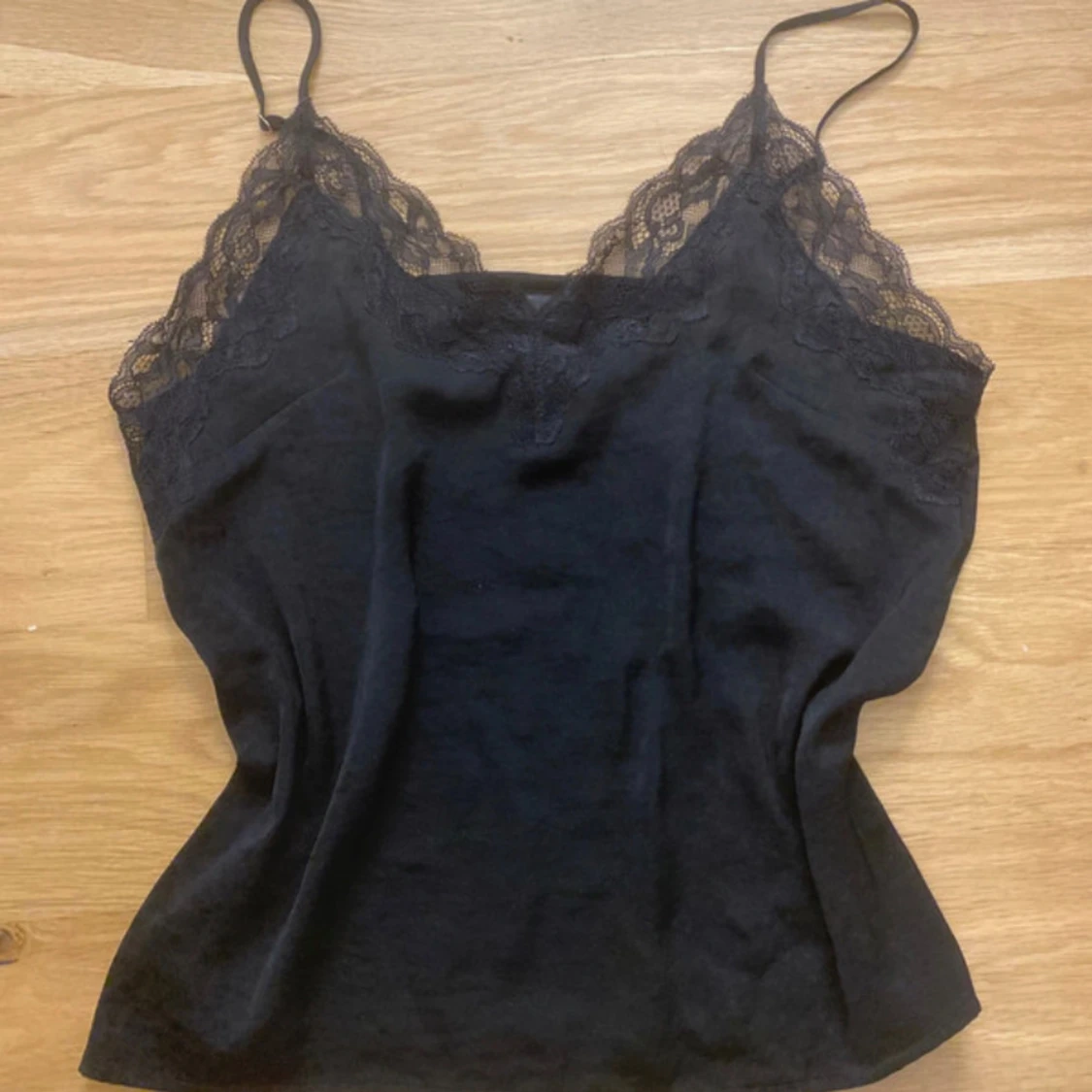 Snyggt svart linne med smala axelband och spetsdetaljer längs halsringningen. Perfekt för en stilren look.