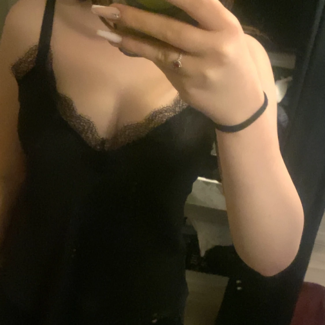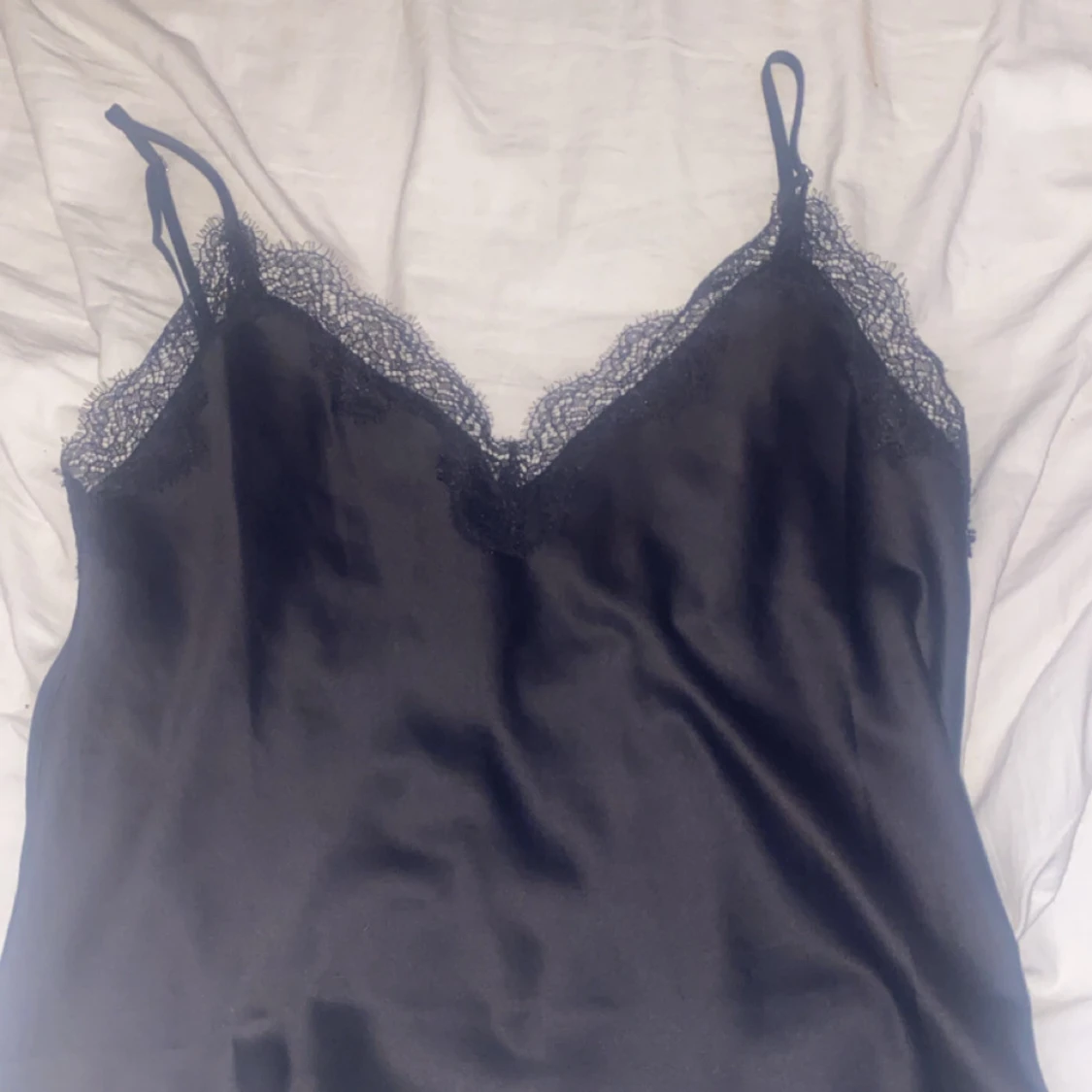 Snyggt svart linne med spetsdetaljer längs halsringningen och tunna axelband. Perfekt för en elegant och stilren look.