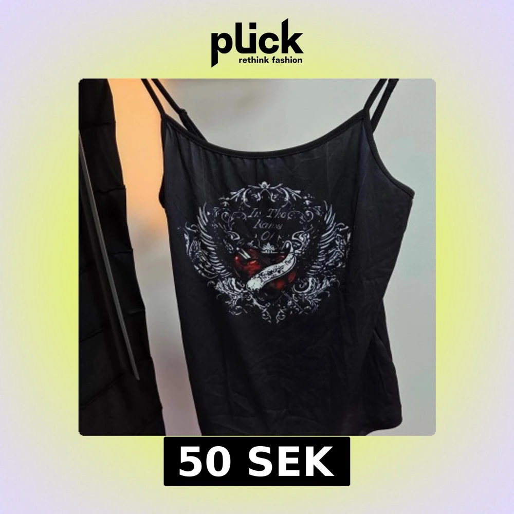 Säljer ett svart linne med tunna axelband och ett detaljerat tryck framtill med hjärta, vingar och texten 'In The Hands Of'. Toppen har en cool vibe och är perfekt för dig som gillar edgy stil. Materialet känns mjukt och lätt.