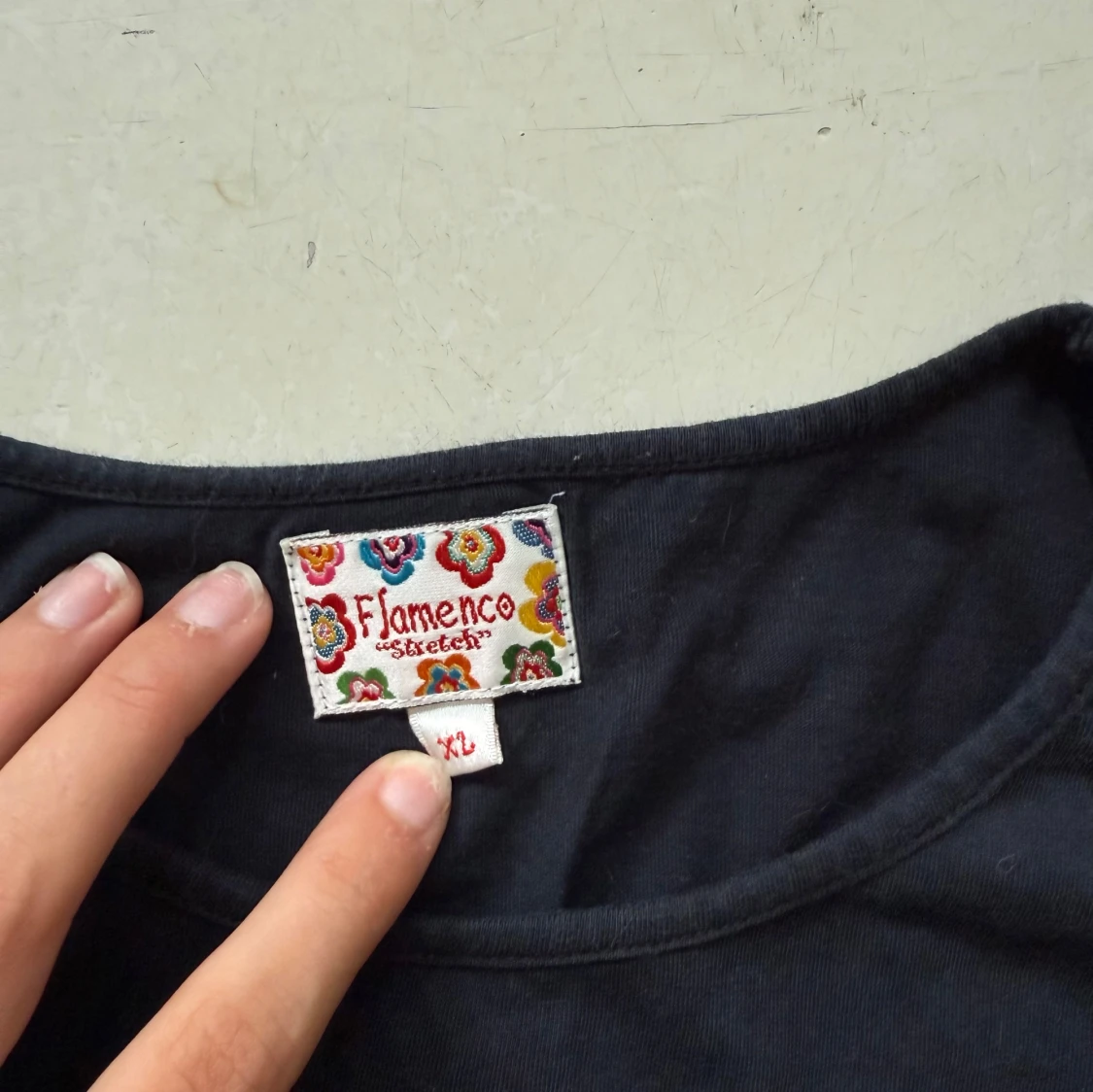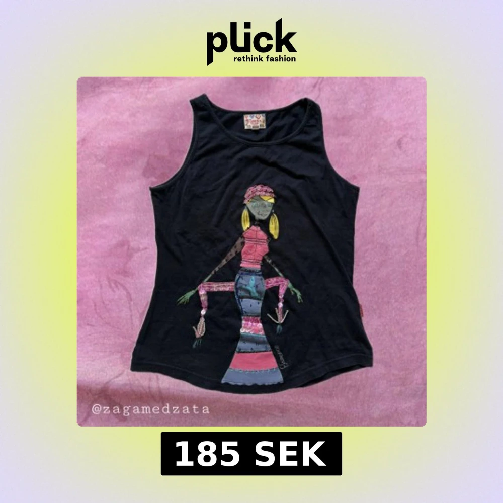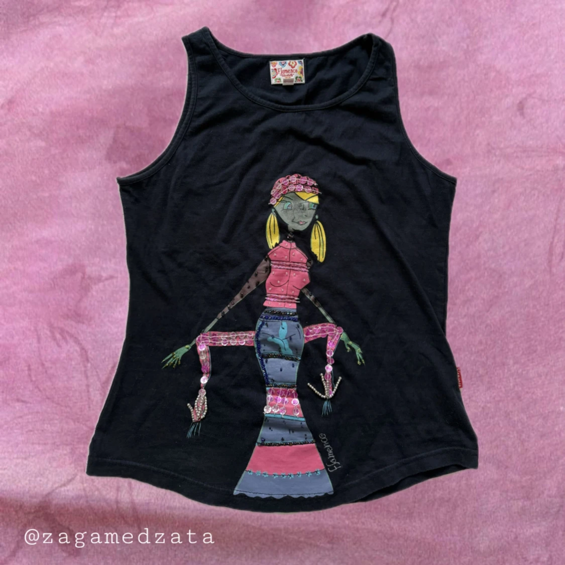 Cool svart linnetopp från Flamenco Stretch med färgglad tryckt illustration av en person i lång klänning framtill. Toppen är ärmlös och har rund halsringning. Perfekt för dig som gillar unika prints och vill sticka ut lite extra.