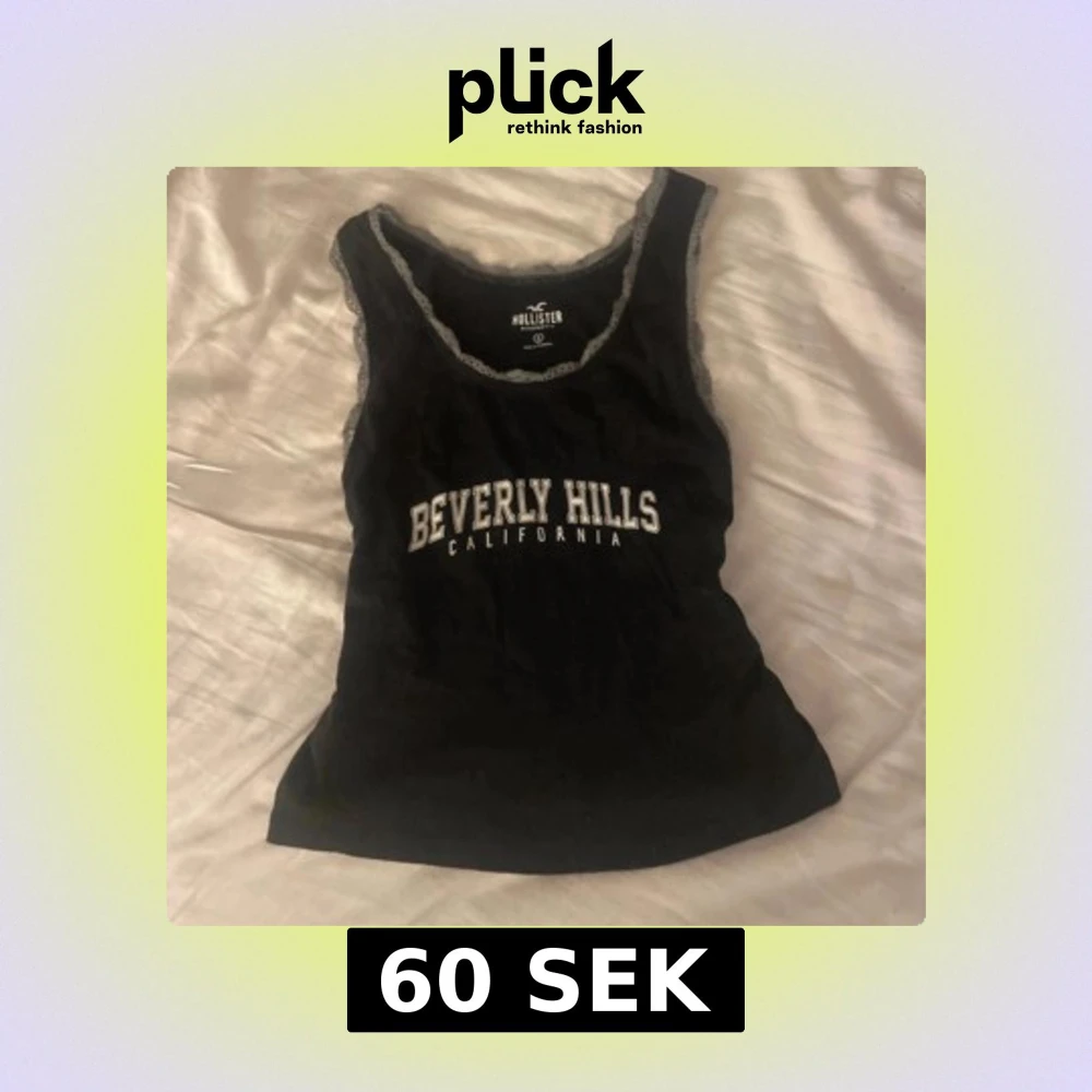 Snygg svart linnetopp från Hollister med texten 'Beverly Hills California' i vitt på framsidan. Toppen har spetsdetaljer runt halsringningen och ärmlösa kanter. Perfekt för en avslappnad stil.