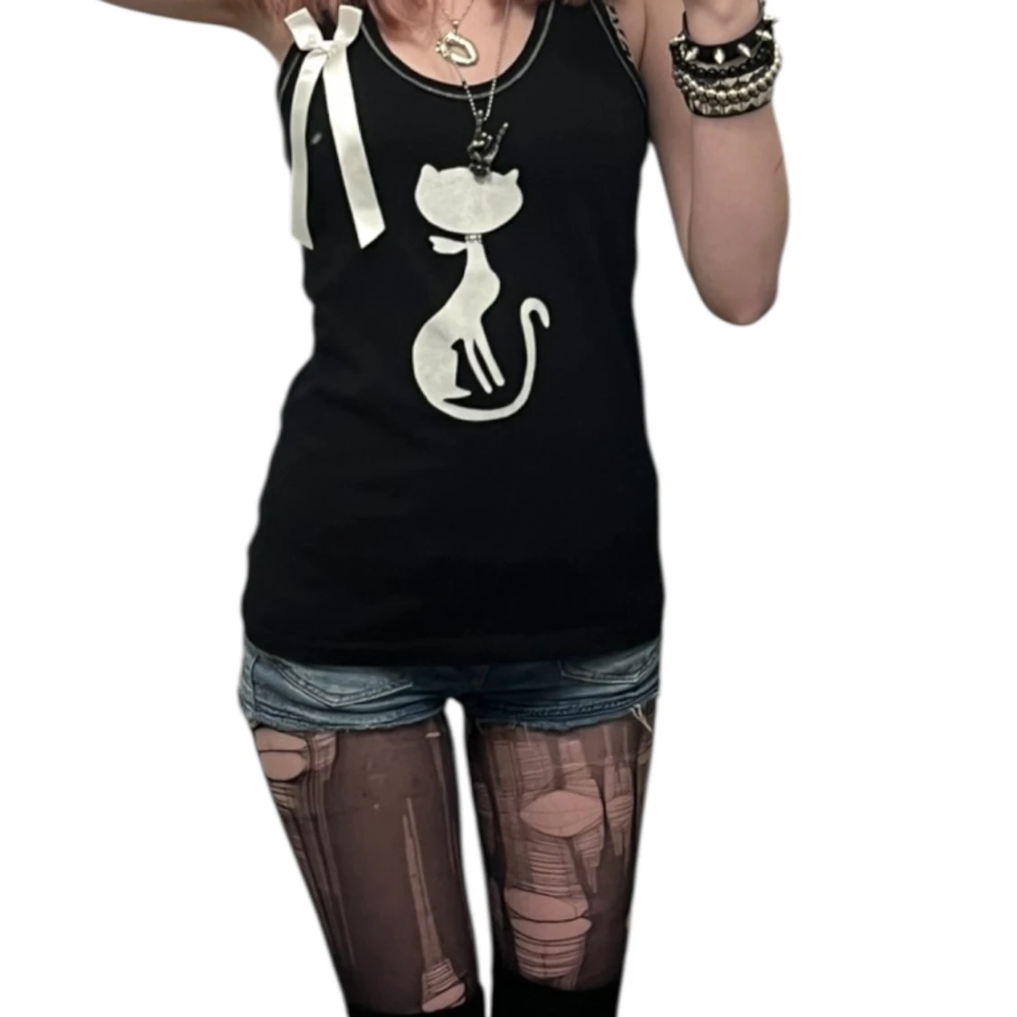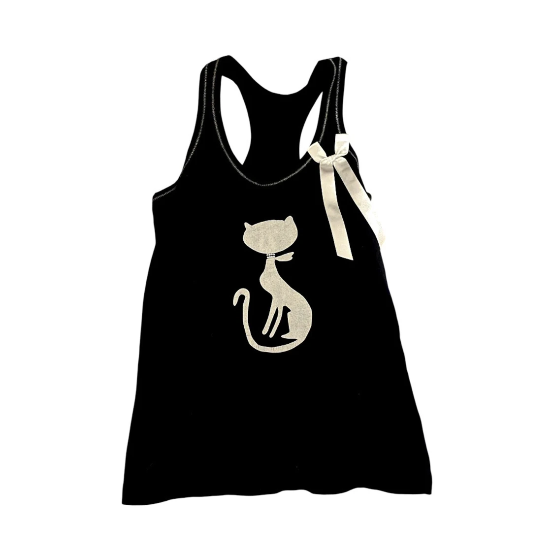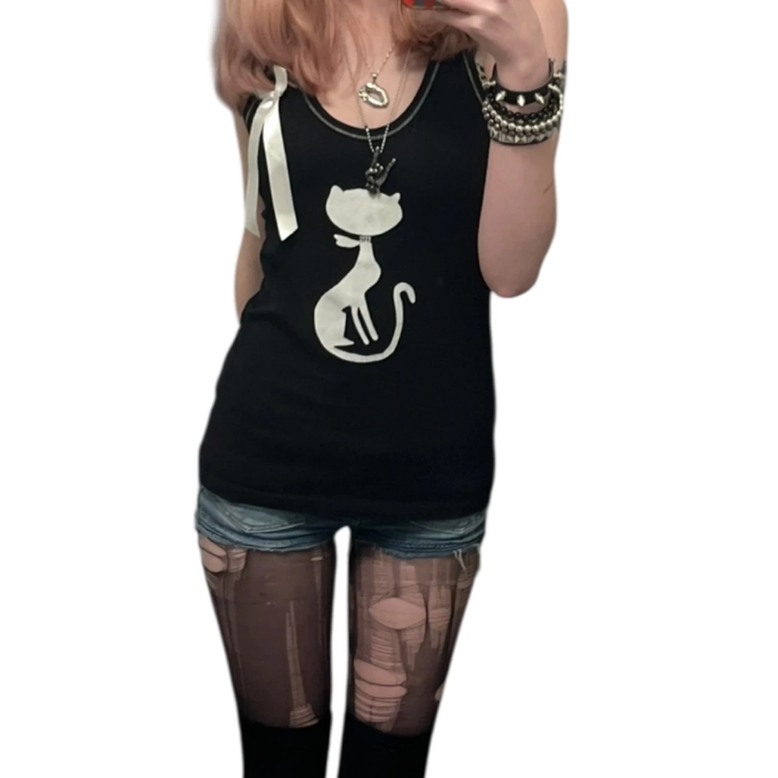 Svart ärmlös linnetopp med racerback och vit tryckt katt framtill. Uppe vid axeln sitter en vit rosett som extra detalj. Toppen har kontrastsömmar och är i mjukt bomullsmaterial. Perfekt för dig som gillar en söt men edgy stil. 100% bomull, hittade ingen storlek på lappen men skulle säga S🙏🏻