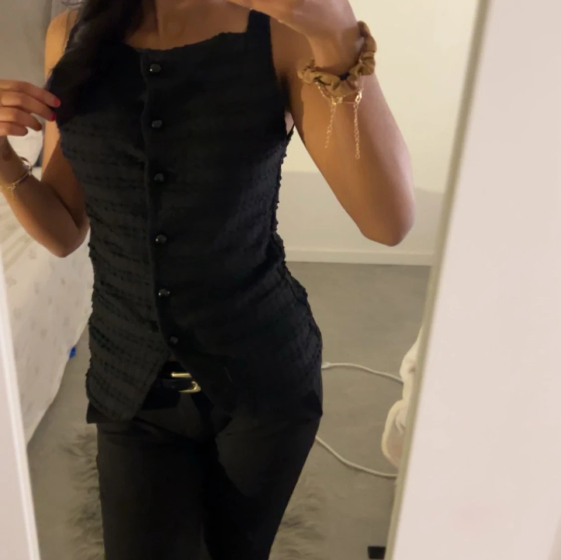 Snygg svart linnetopp med knappar framtill och strukturerat tyg. Toppen är ärmlös och har en figurnära passform som ger en cool och stilren look. Perfekt att matcha med både jeans och kostymbyxor.