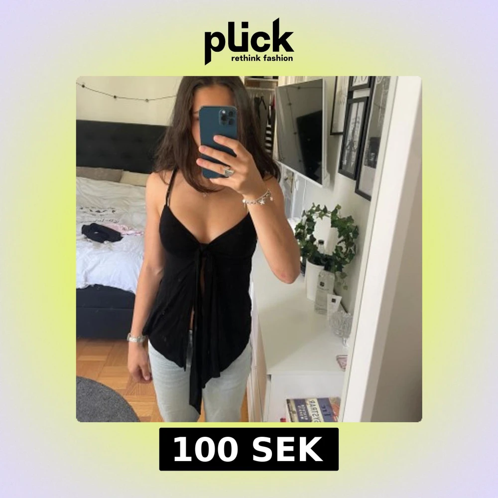 Svart linnetopp från Gina Tricot med smala axelband och snygg knytning framtill. Toppen har en lätt v-ringad form och är tillverkad i ett mjukt, tunt material som känns skönt mot huden.