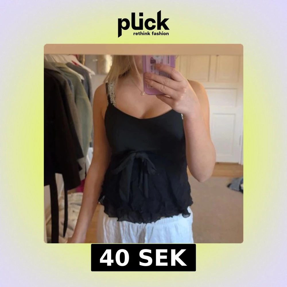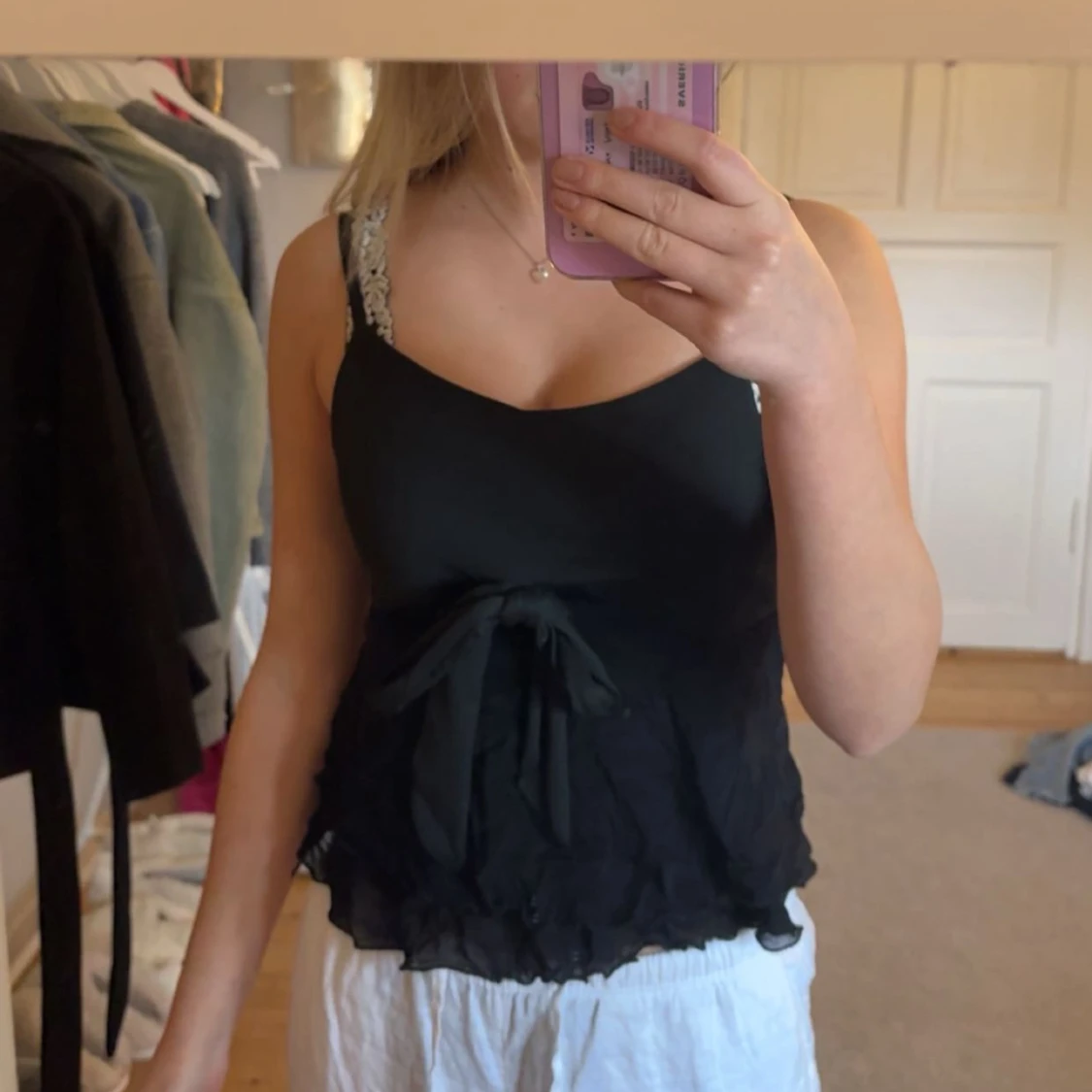 Snygg svart linnetopp med smala axelband och dekorativ knytning framtill. Toppen har volangkant nedtill och lätt rynkad effekt för en feminin look. Perfekt till jeans eller kjol för en trendig stil.