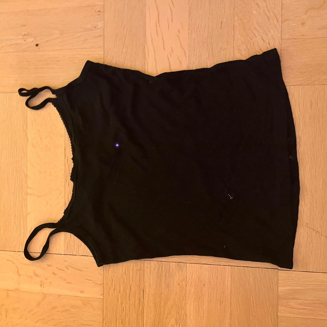 En enkel och stilren svart linnetopp med smala axelband och en liten söt rosett framtill. Toppen har en rak passform och ärmlös design, perfekt att matcha med jeans eller kjol. Materialet känns mjukt och bekvämt mot huden.