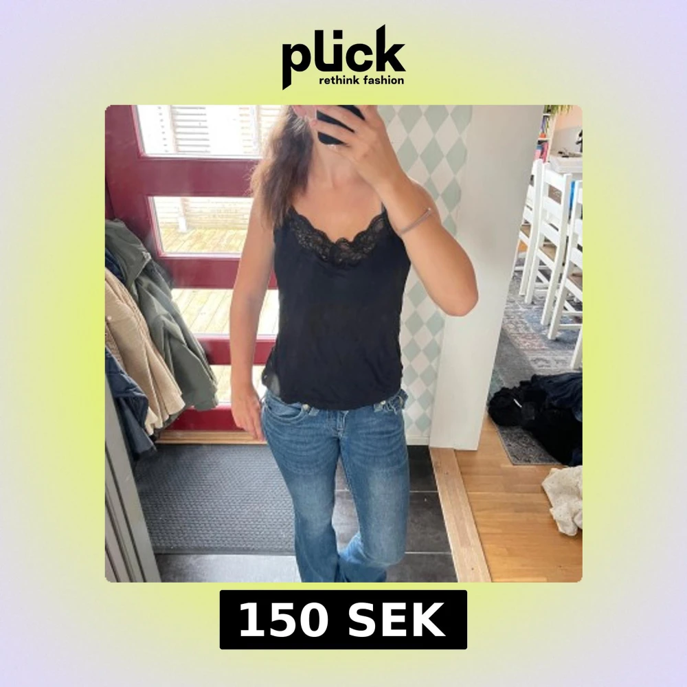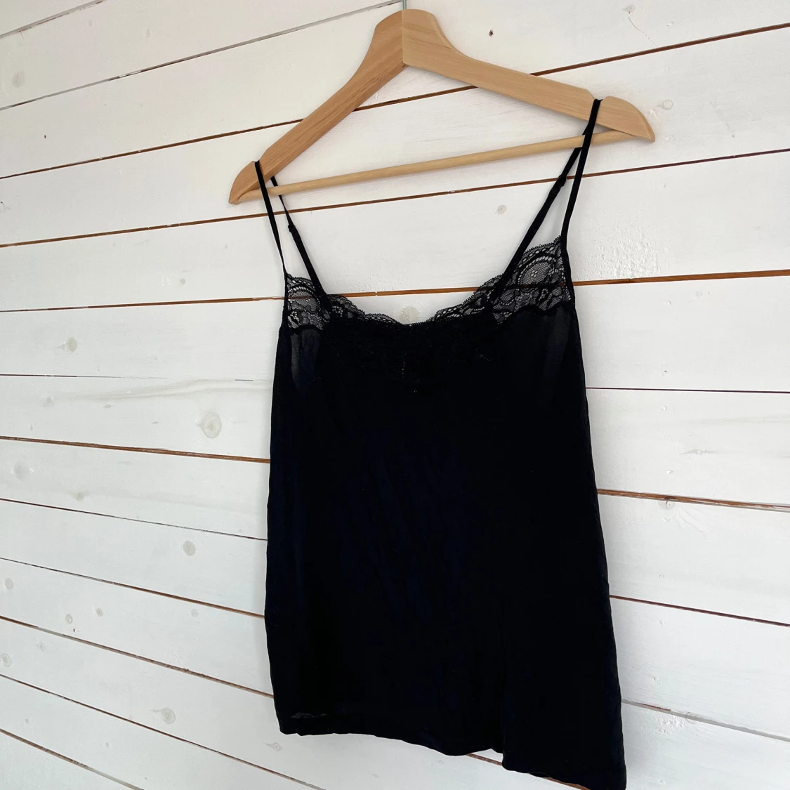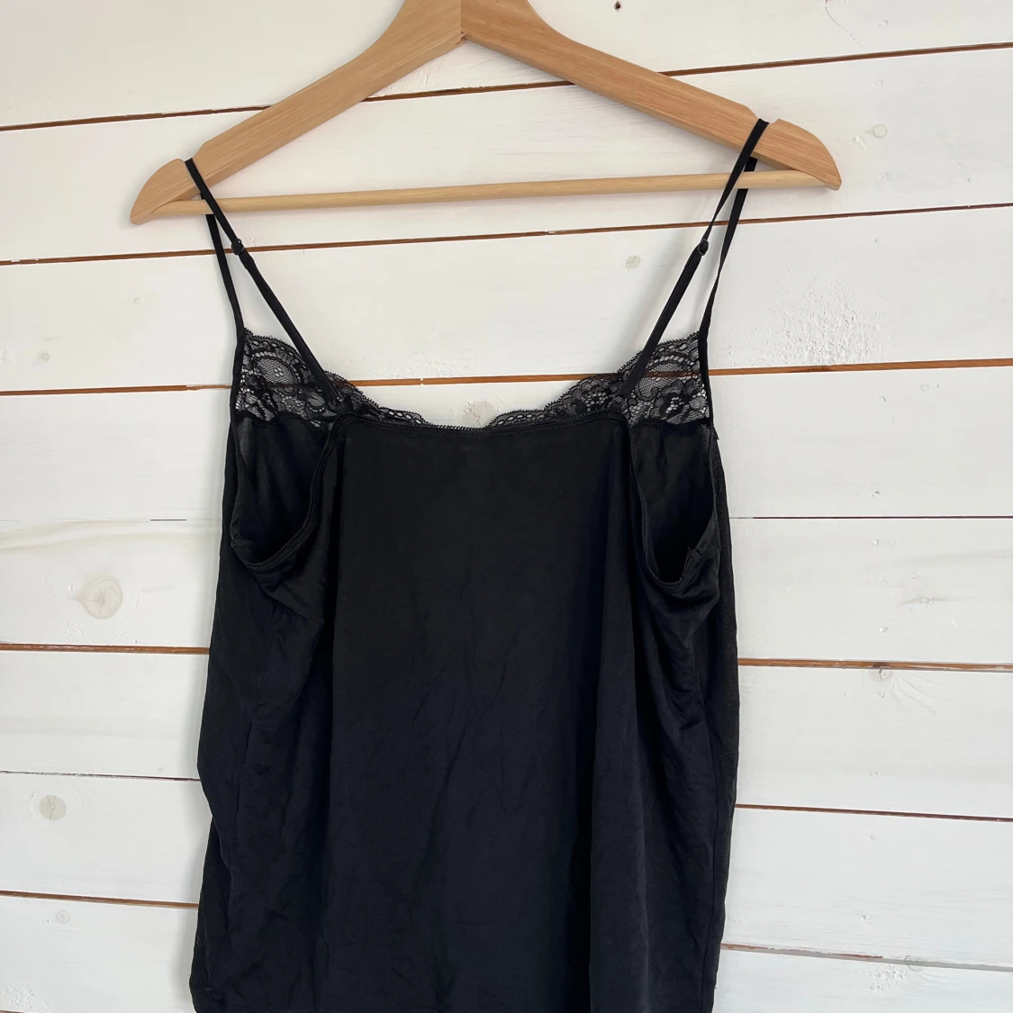 Svart linnetopp med tunna axelband och snygg spetskant längs urringningen. Toppen har en enkel, rak passform och är tillverkad i ett mjukt tyg som känns lätt mot huden. Perfekt att styla med jeans eller kjol för en trendig look. Köpt second hand men bra skick. Är i storlek m men passar även mig som normalt bär s.