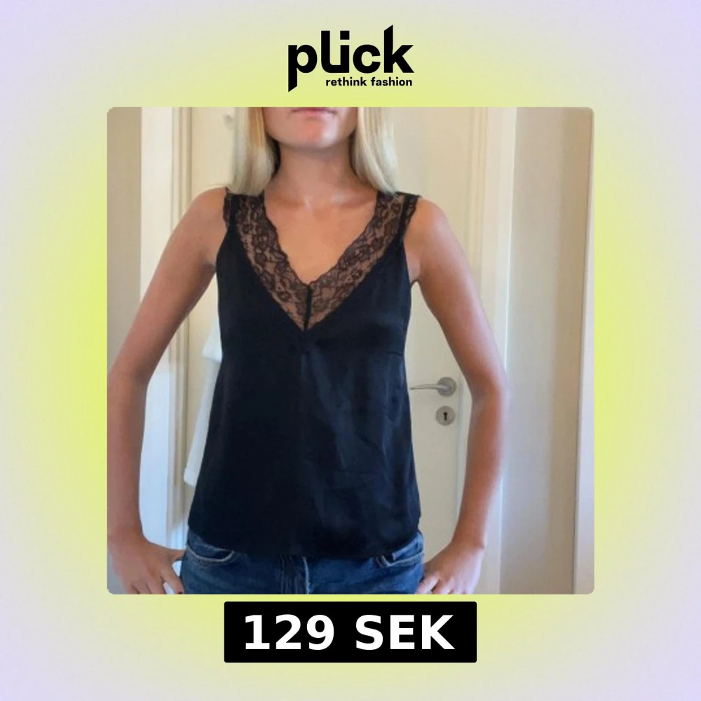 Svart linnetopp med djup v-ringning och bred spetskant runt halsen.