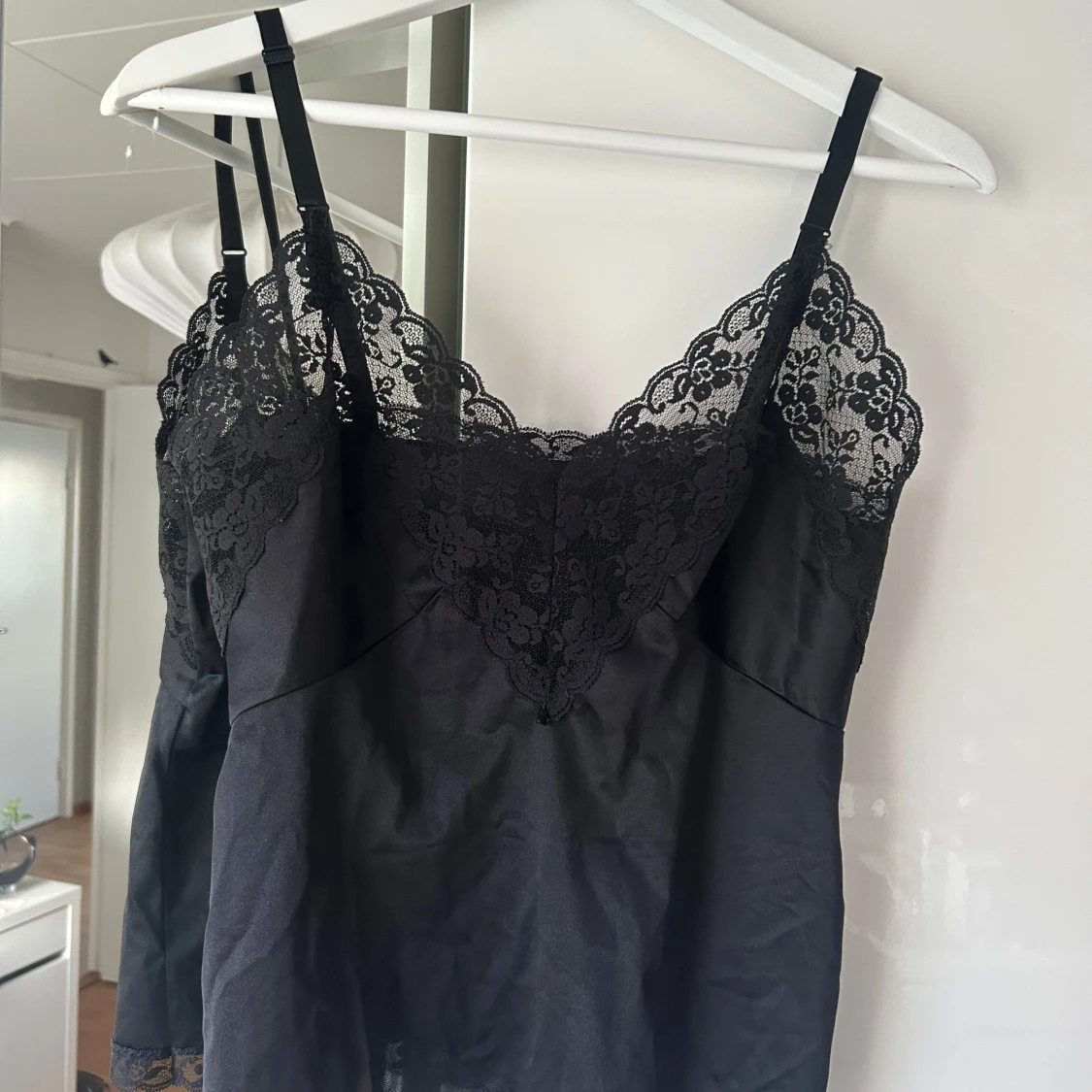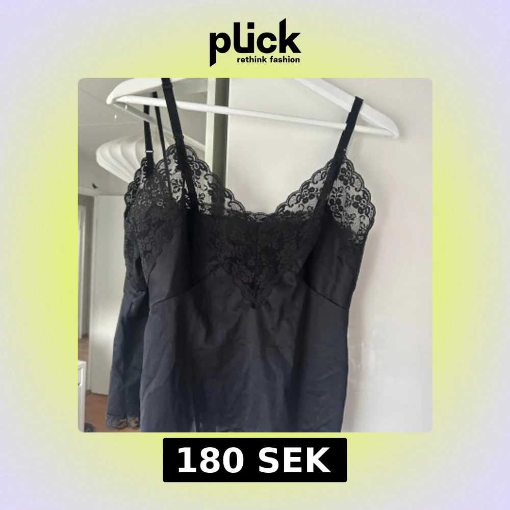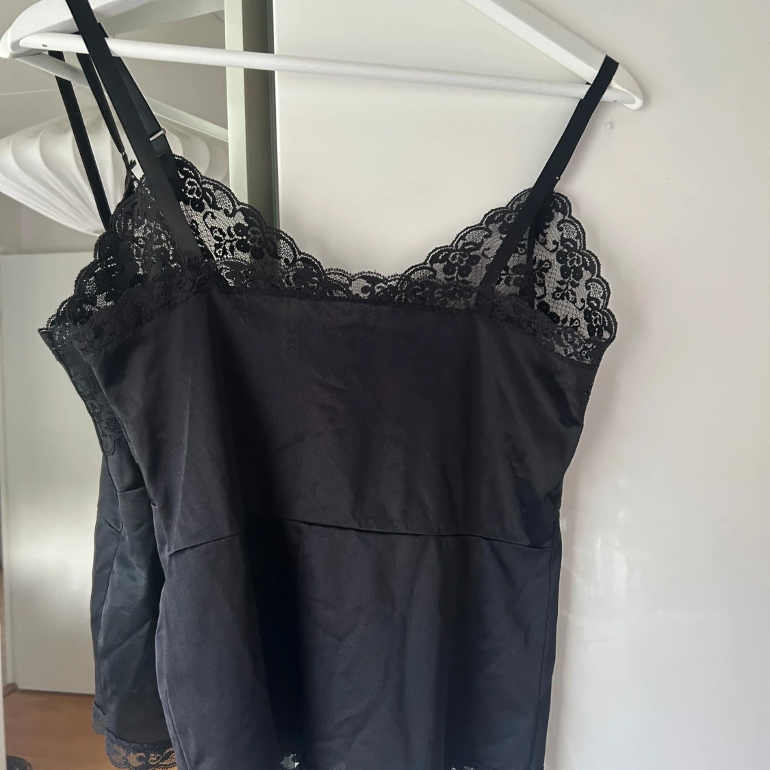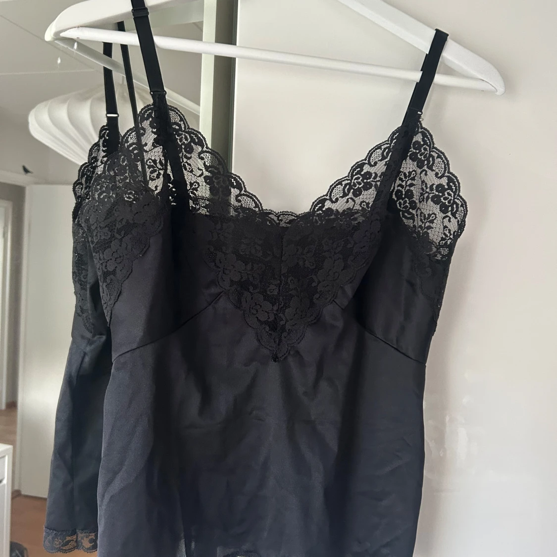 Säljer en svart linnetopp med tunna axelband och vacker spets längs urringningen och upptill. Toppen har en feminin och elegant look, perfekt att styla till olika outfits. Storlek S💕