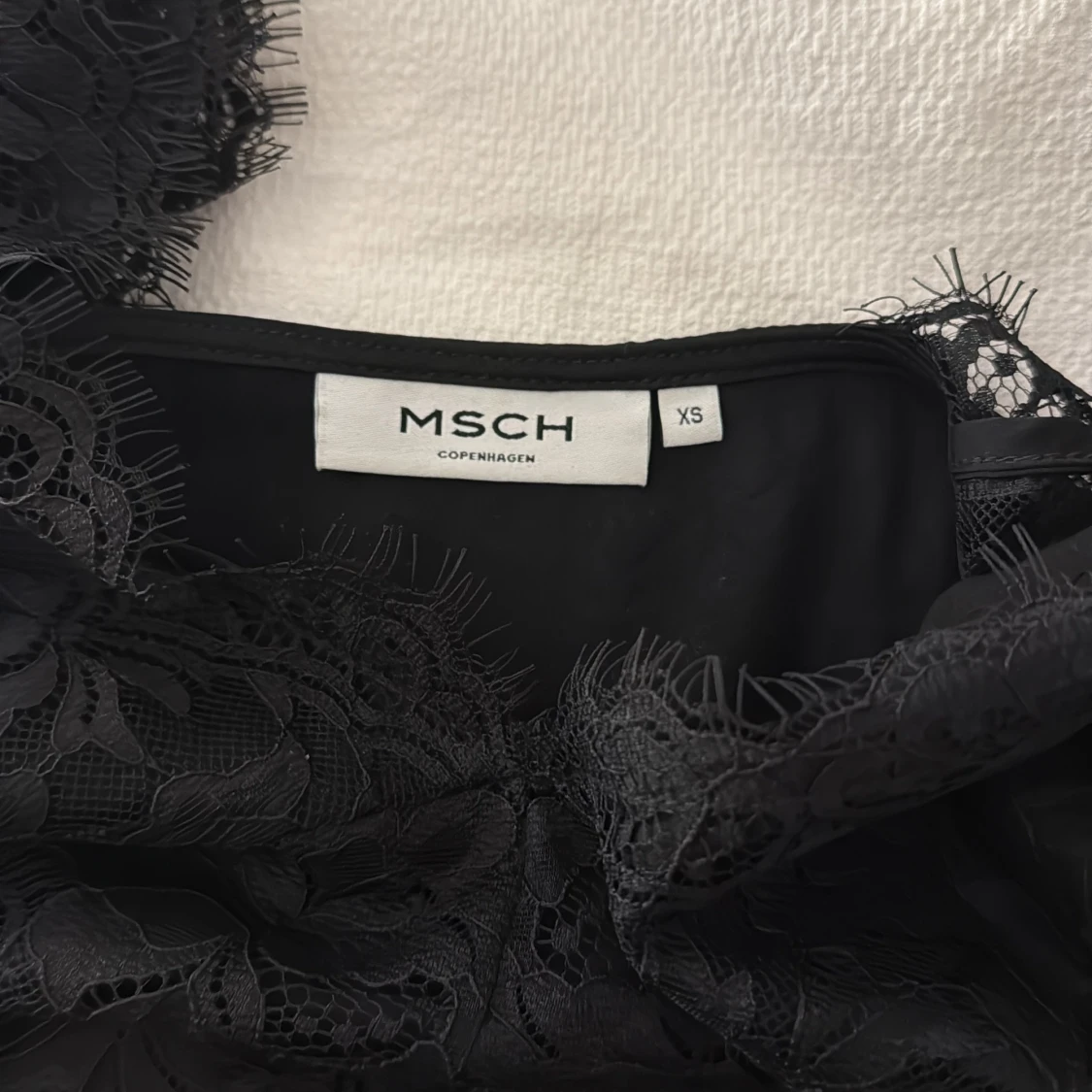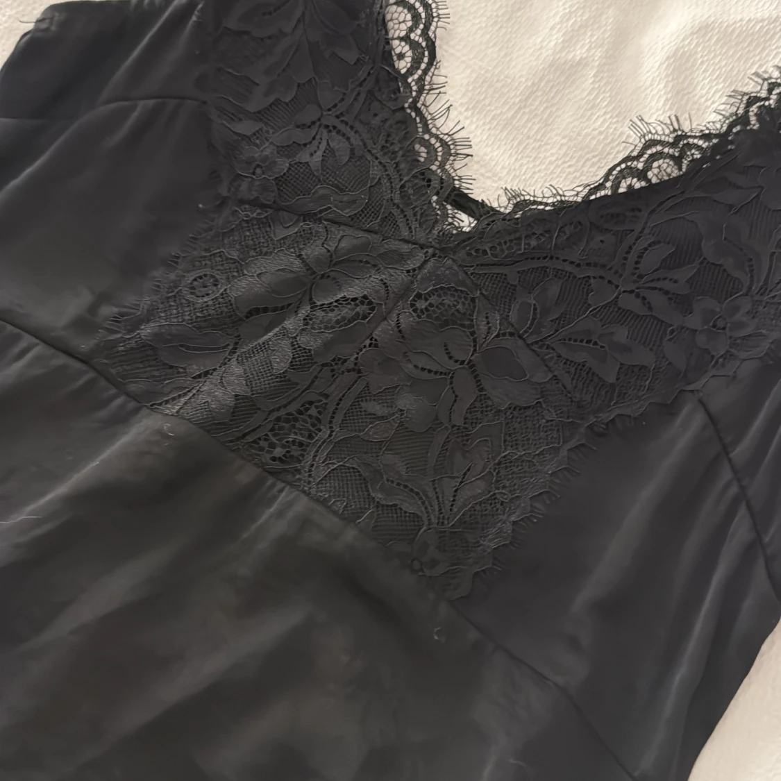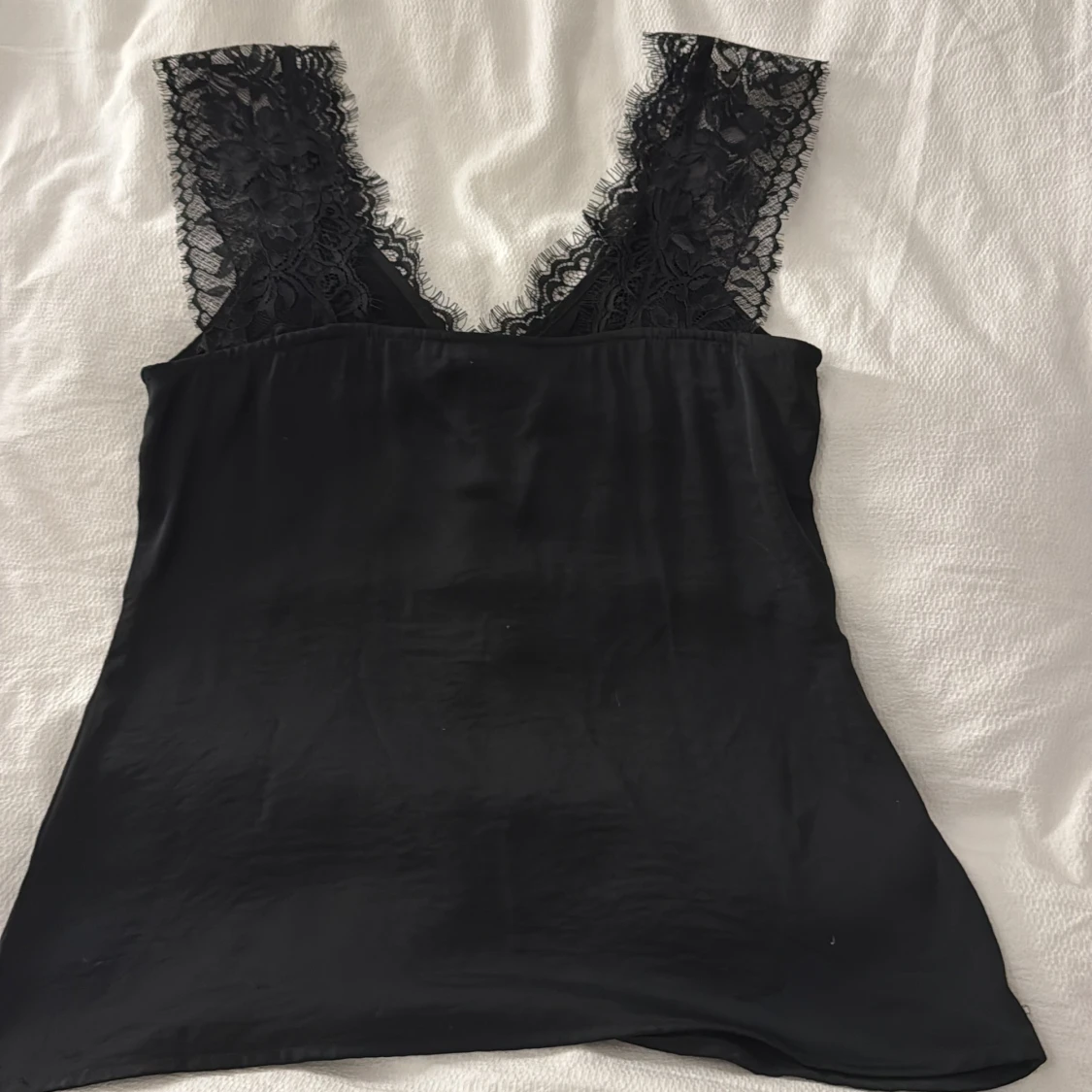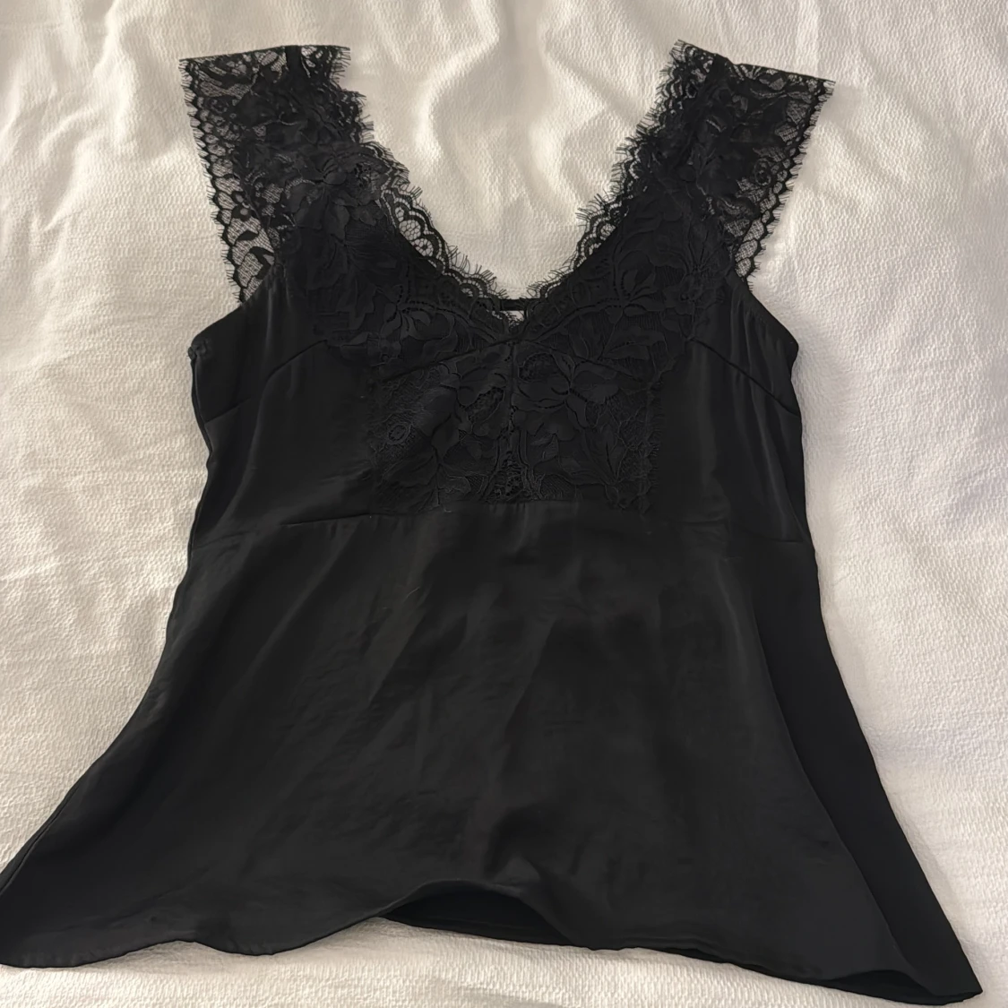Supersnygg svart linnetopp med breda axelband och v-ringning, dekorerad med blommig spets framtill och längs axelpartiet. Materialet är mjukt och glansigt, vilket ger en lyxig känsla. Perfekt för dig som gillar stilrena och feminina detaljer. Den är figursydd och fin från MSCH copenhagen.