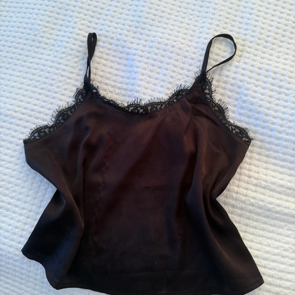Snygg svart linnetopp med tunna axelband och dekorativ spetskant längs halsringningen. Toppen har en mjuk, glansig yta som ger en lyxig känsla och är perfekt för att lyfta din outfit. Passar dig som gillar stilrena och trendiga plagg.