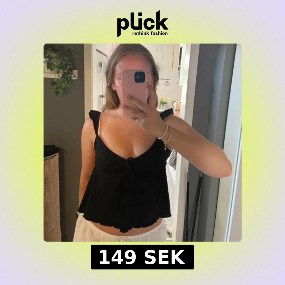 Supersöt svart linnetopp från Nelly med volangdetaljer på axelbanden och lätt v-ringning. Toppen har knyt framtill och är croppad med flowig passform🩷