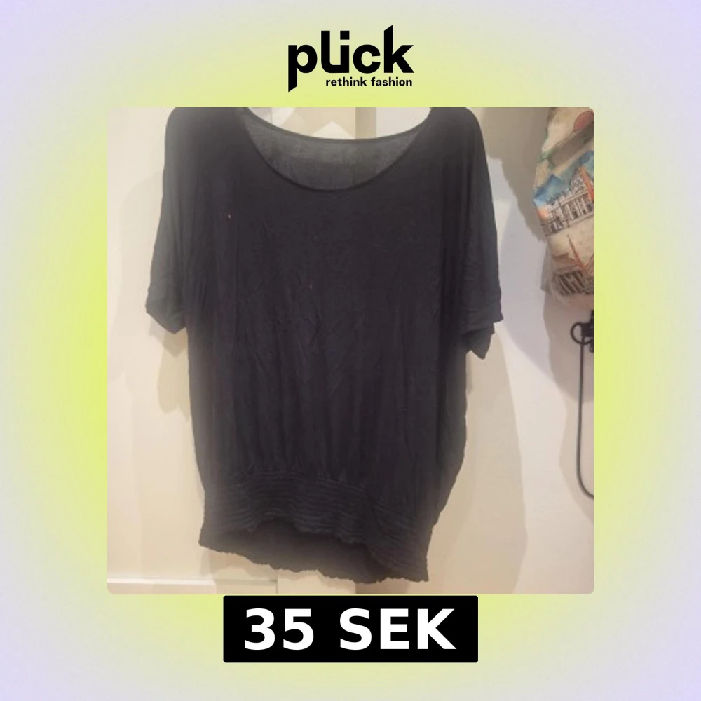 En svart, lös topp med rund halsringning och korta ärmar. Toppen har en bred, ribbad kant nedtill som ger en avslappnad och cool siluett. Perfekt för dig som gillar en enkel men ändå snygg stil.