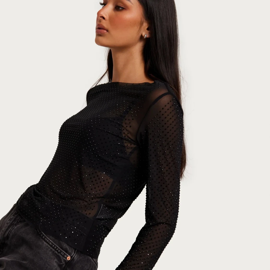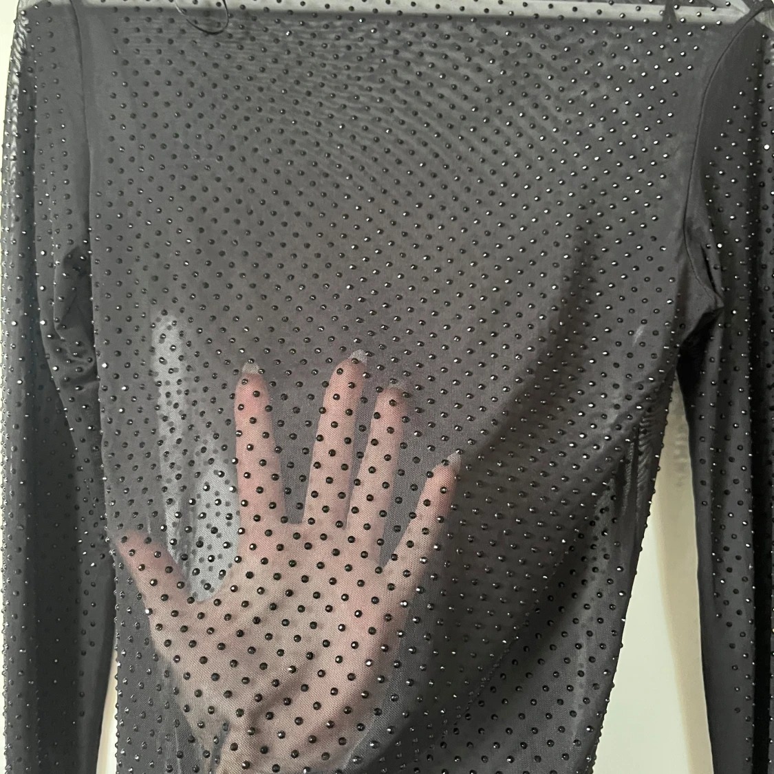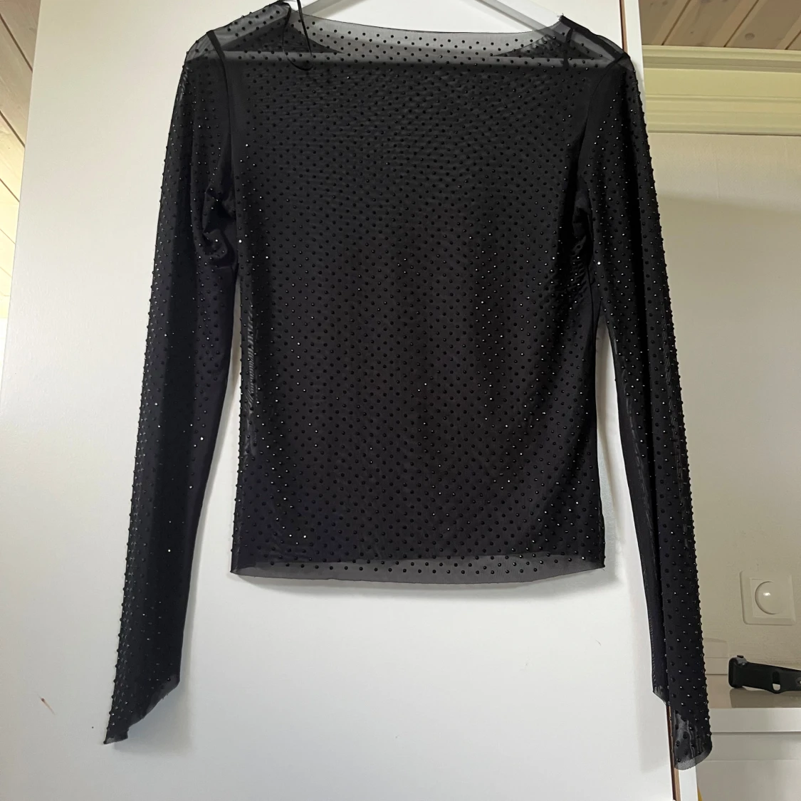 Säljer en svart mesh topp med lång ärm och glittriga små stenar över hela tyget. Toppen är lätt genomskinlig, perfekt för festliga tillfällen 😊 Använd fåtal gånger