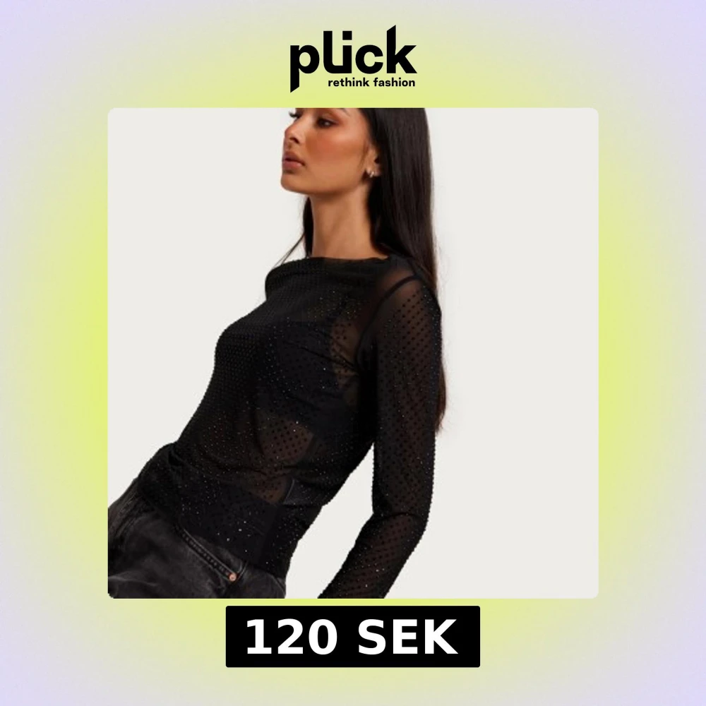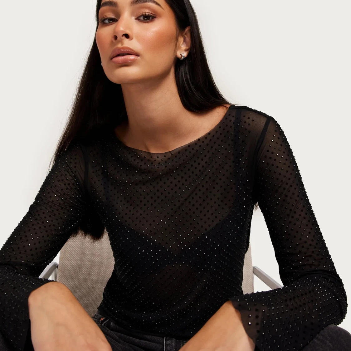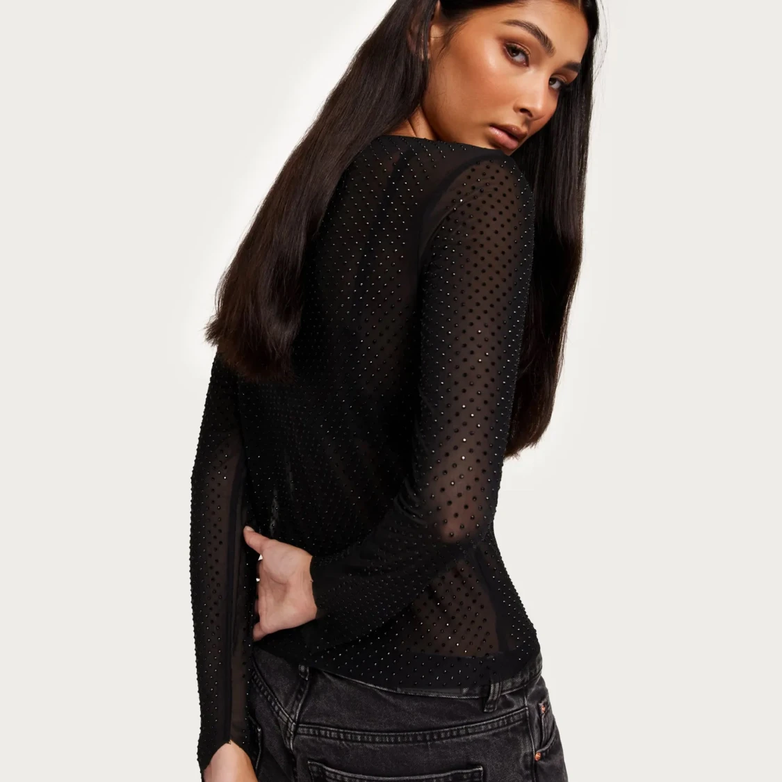 Säljer en svart mesh topp med lång ärm och glittriga små stenar över hela tyget. Toppen är lätt genomskinlig, perfekt för festliga tillfällen 😊 Använd fåtal gånger
