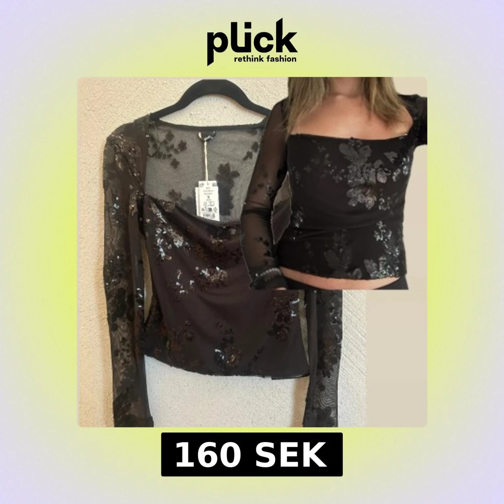Säljer en svart mesh topp med långa ärmar och blommiga paljettdetaljer. Toppen har en snygg draperad urringning och transparenta partier på ärmar och rygg. Perfekt för dig som vill sticka ut med lite extra glitter.