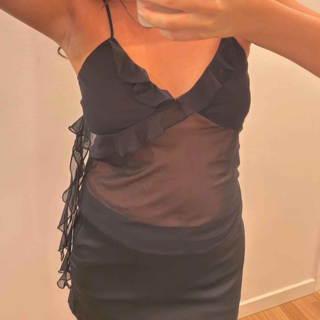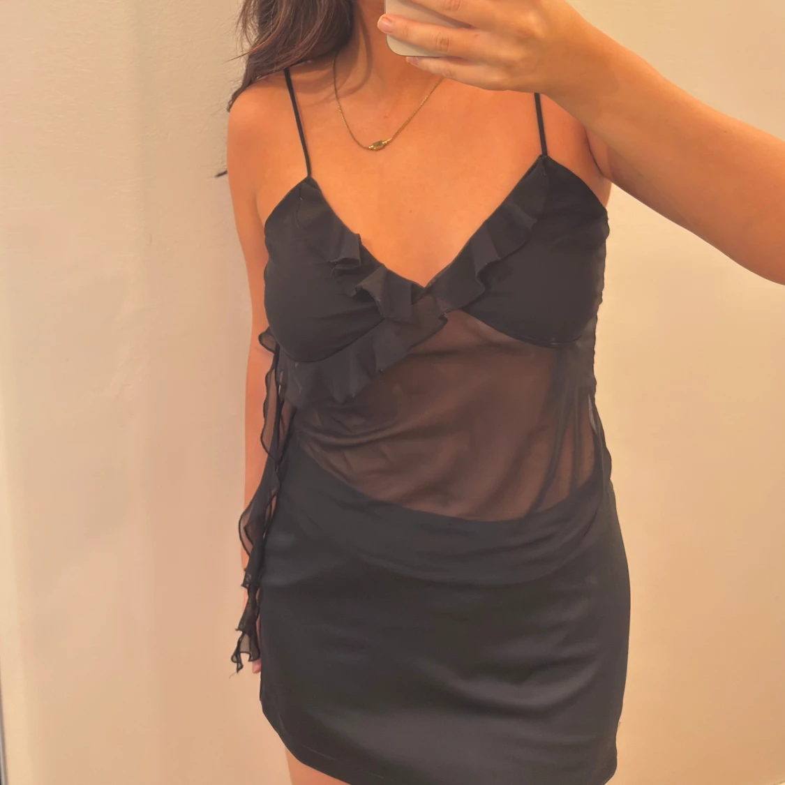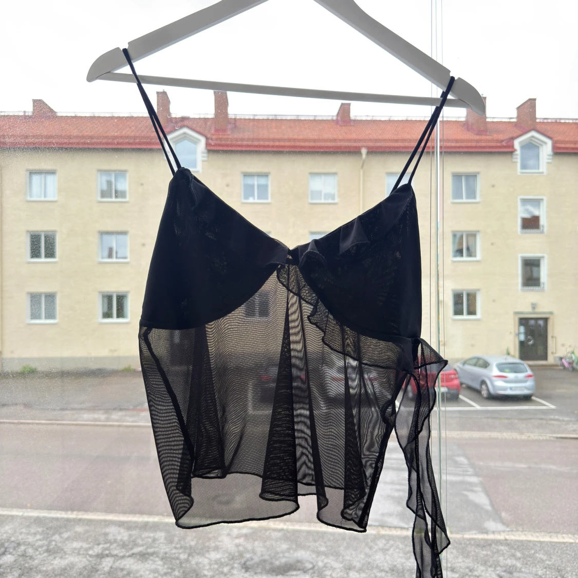 Svart topp med tunna axelband och transparent mesh överdel. V-ringad med volangdetaljer framtill och längs sidan. Perfekt för dig som vill sticka ut med en edgy och trendig look. Säljer pga att den är för liten. As snygg dock! Lappen finns inte kvar då den synes på baksidan annars.