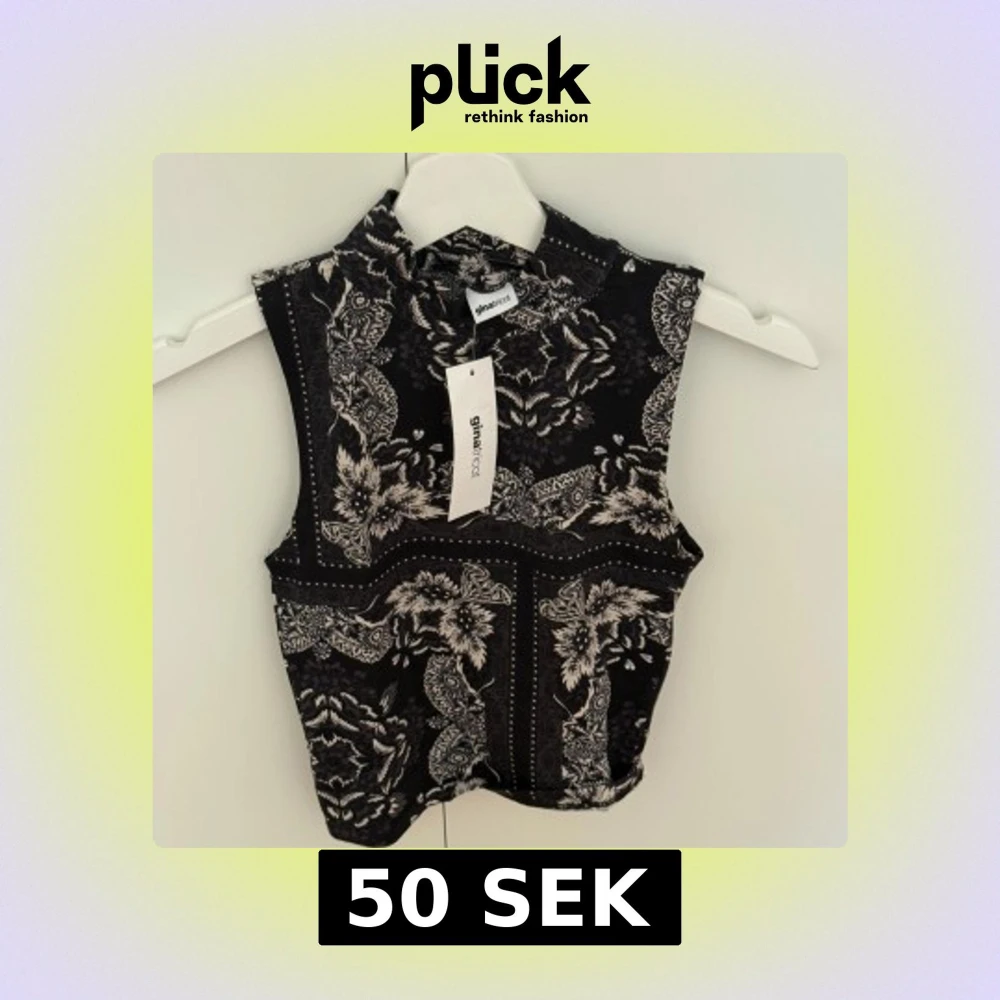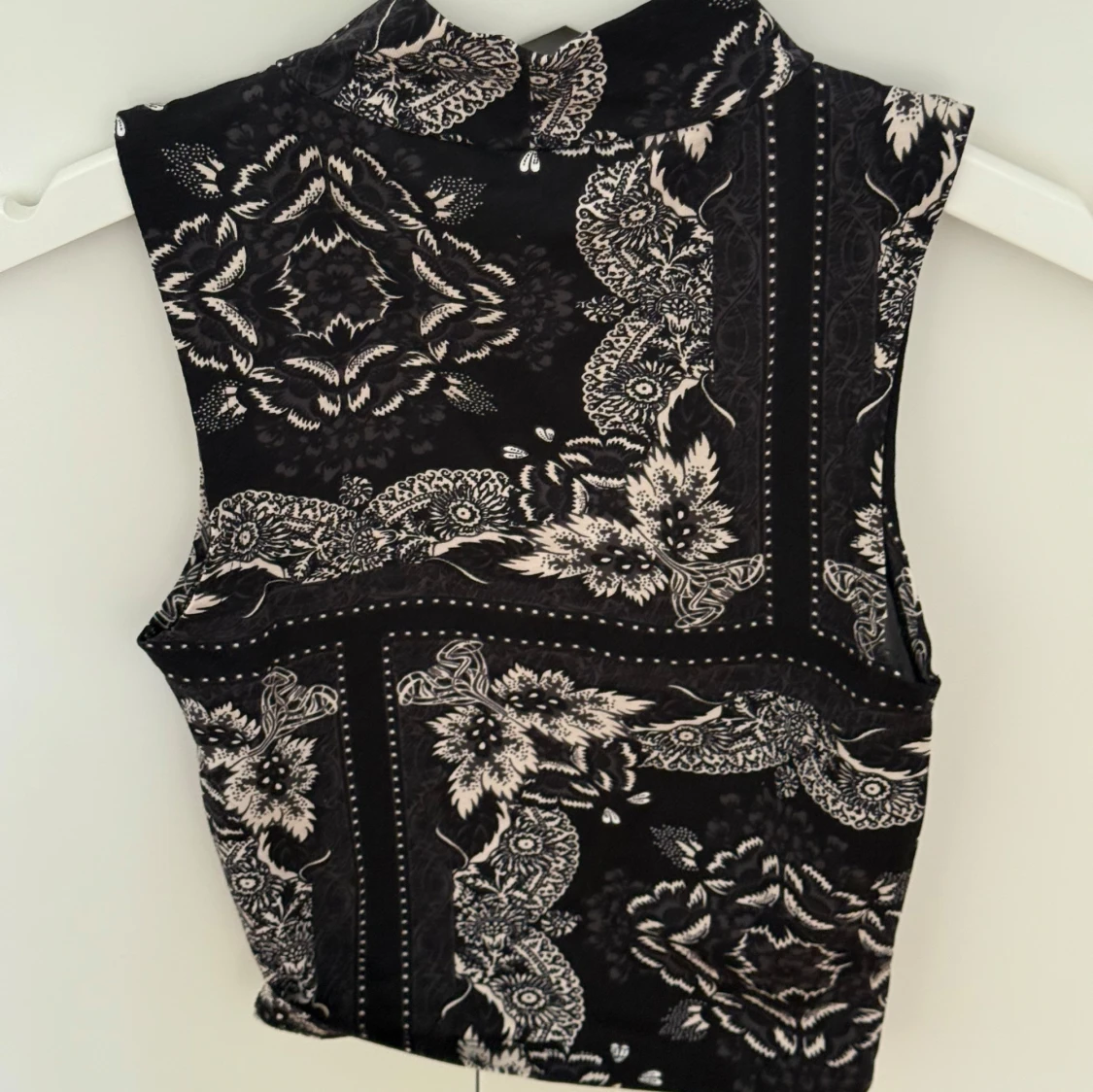 Snygg svart ärmlös topp från Gina Tricot med hög hals och detaljerat paisleyinspirerat mönster i vitt. Croppad modell som sitter tajt och ger en cool vibe. Perfekt att styla med jeans eller kjol för en trendig look.