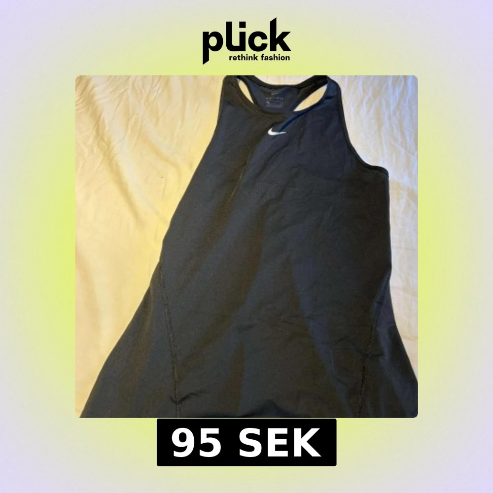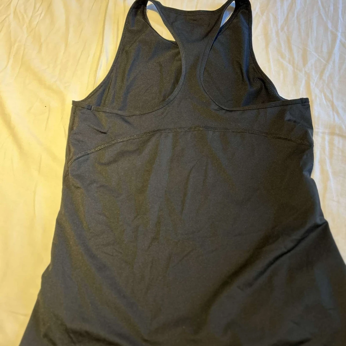 Säljer en svart sportig linnetopp från Nike med Dri-Fit-teknologi. Toppen har en klassisk racerback-design och ett litet vitt Nike-märke framtill. Perfekt för träning och aktiva dagar, tillverkad i ett lätt och snabbtorkande syntetmaterial.