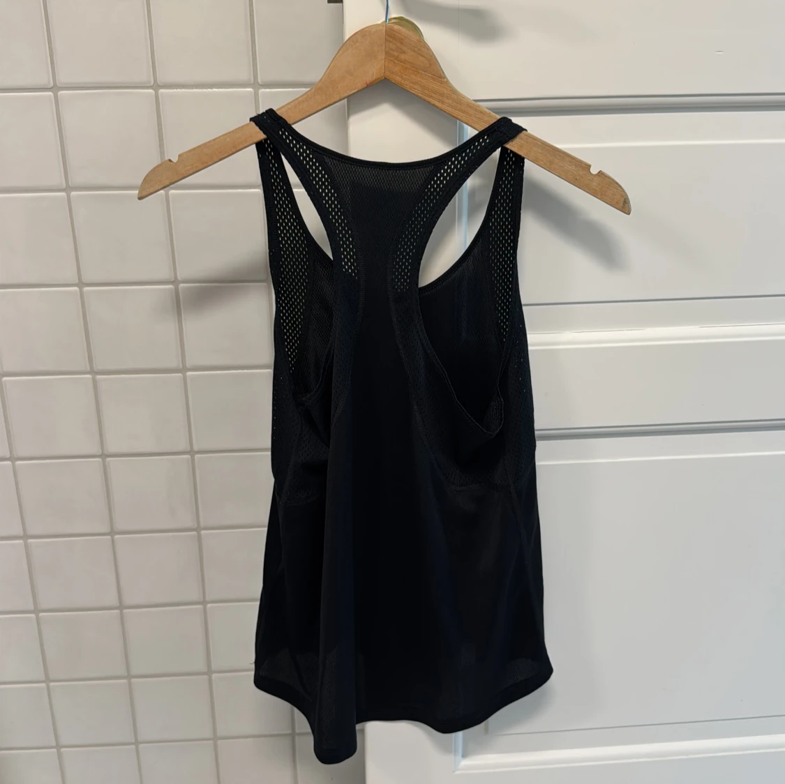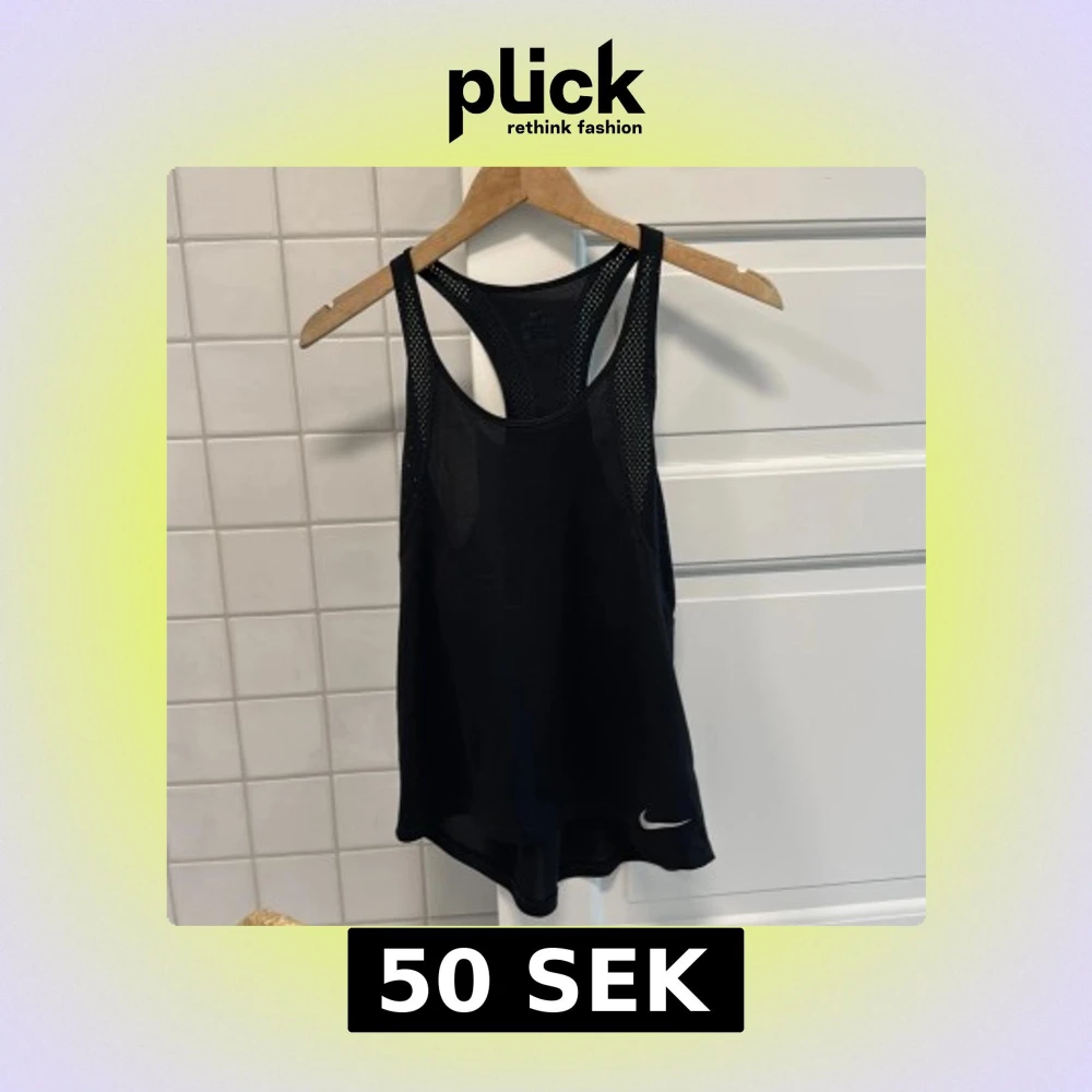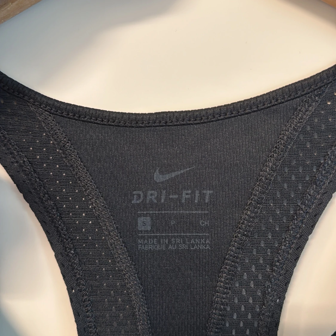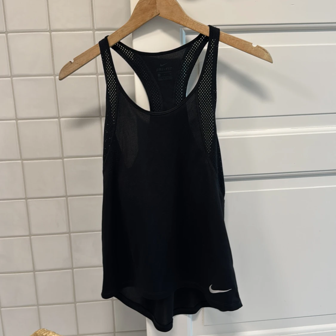 Svart sportigt linne från Nike med Dri-FIT-teknologi. Sval mesh på sidorna och racerback-rygg för extra ventilation. Liten vit Nike-logga framtill. Perfekt för dig som vill ha en lätt och luftig topp till träningen.