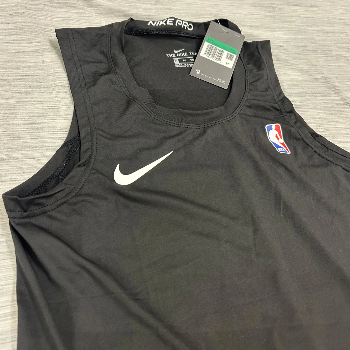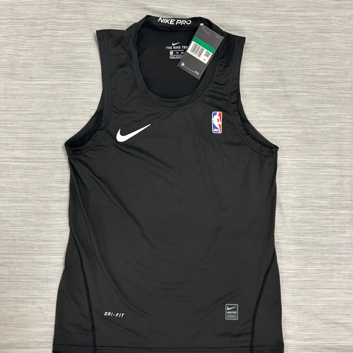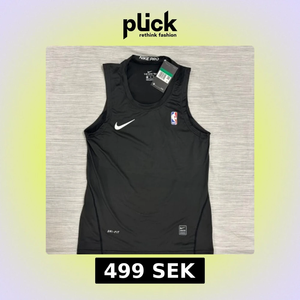 Svart ärmlös träningströja från Nike Pro med NBA-logga på bröstet och vit Nike Swoosh. Tillverkad i lätt och stretchig polyester med Dri-FIT-teknologi som håller dig torr under intensiva träningspass. Perfekt för basket eller gymmet.