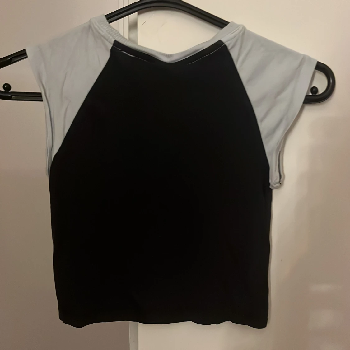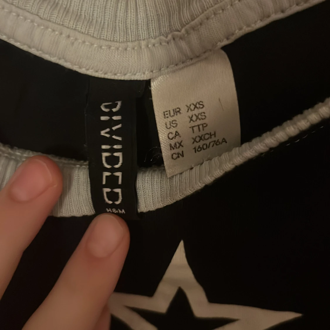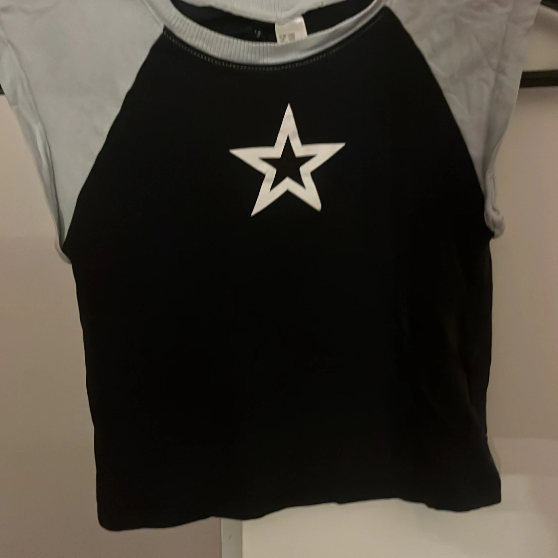 Cool croppad topp från H&M Divided i svart med ljusgrå ärmar och halsringning. Framtill finns en vit stjärna som ger en edgy vibe. Toppen är ärmlös och har en slim passform, perfekt för dig som gillar streetstyle.