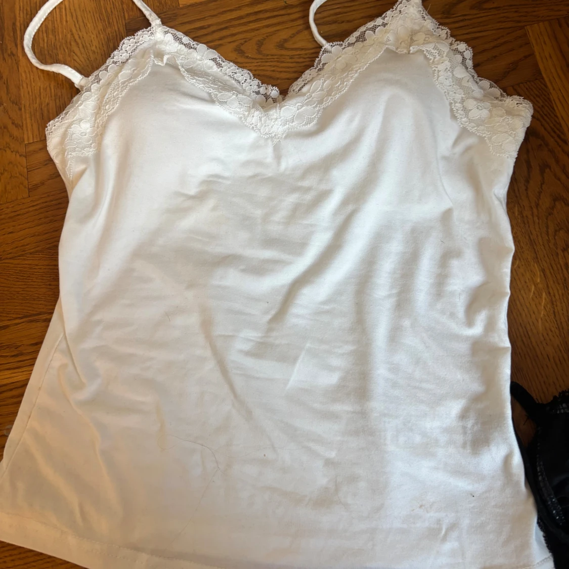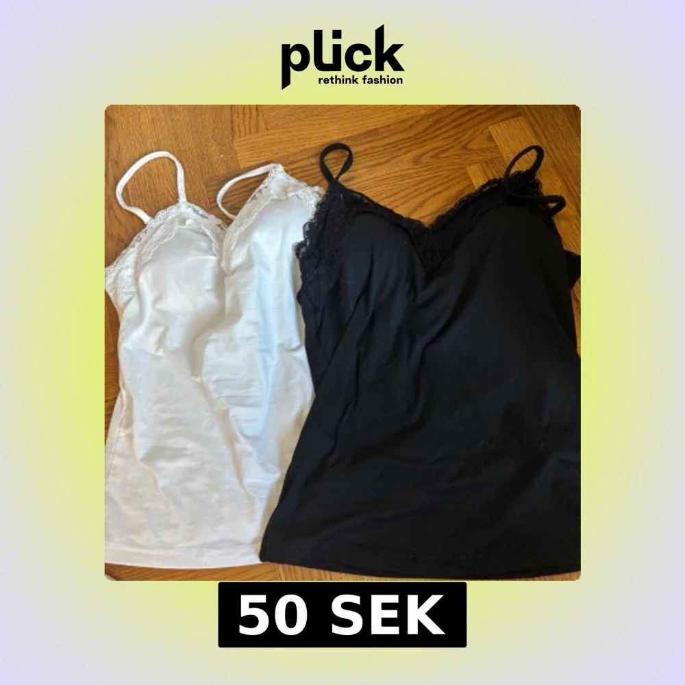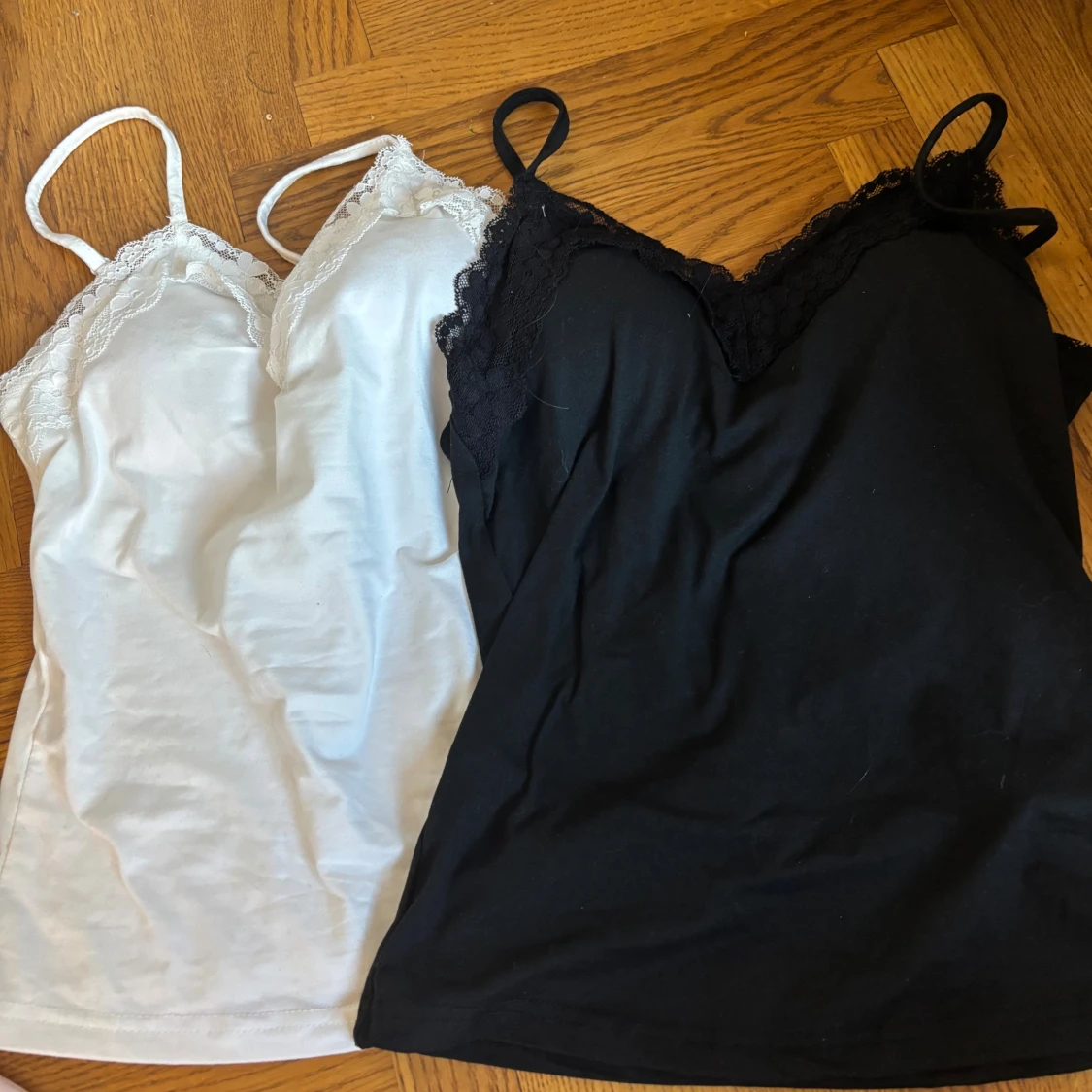 Två stilrena linnetoppar i svart och vitt med tunna axelband och v-ringad spetskant upptill. Båda är i mjuk bomull och har en feminin look med spetsdetaljer längs urringningen. Perfekta att matcha med jeans eller kjol för en enkel och snygg outfit. Har bh kupor