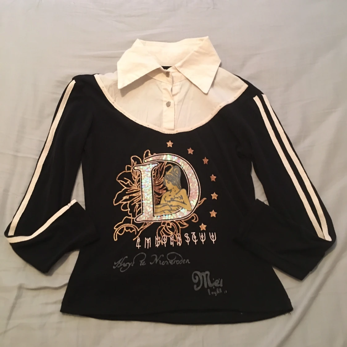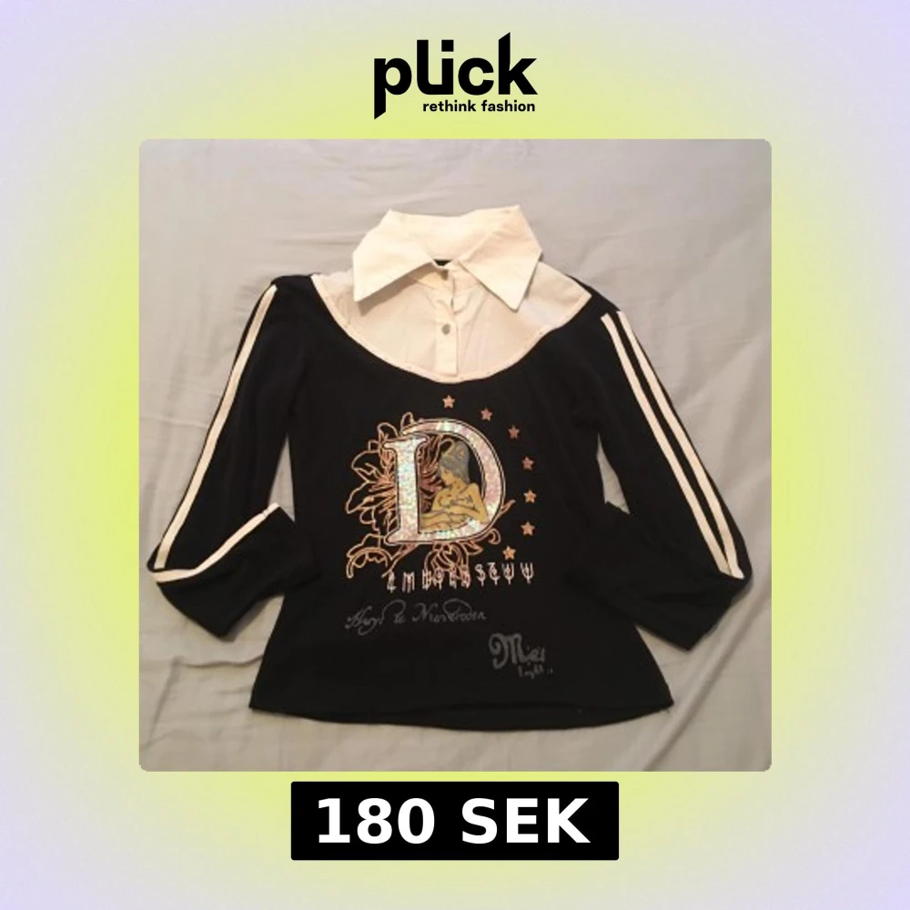 Snygg svart tröja med vita detaljer och ett stort tryck på framsidan. Tröjan har en unik design med en vit krage och knappar, samt vita ränder längs ärmarna. Perfekt för en cool och avslappnad stil.