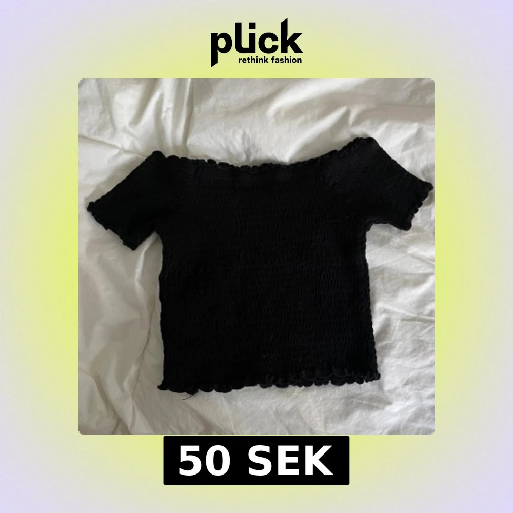 En svart offshoulder topp från Primark med smockad struktur och volangkant vid halsringning och ärmslut. Toppen är kort och sitter tight, perfekt för dig som gillar en trendig och enkel stil. Materialet är mjukt och stretchigt för en bekväm passform.