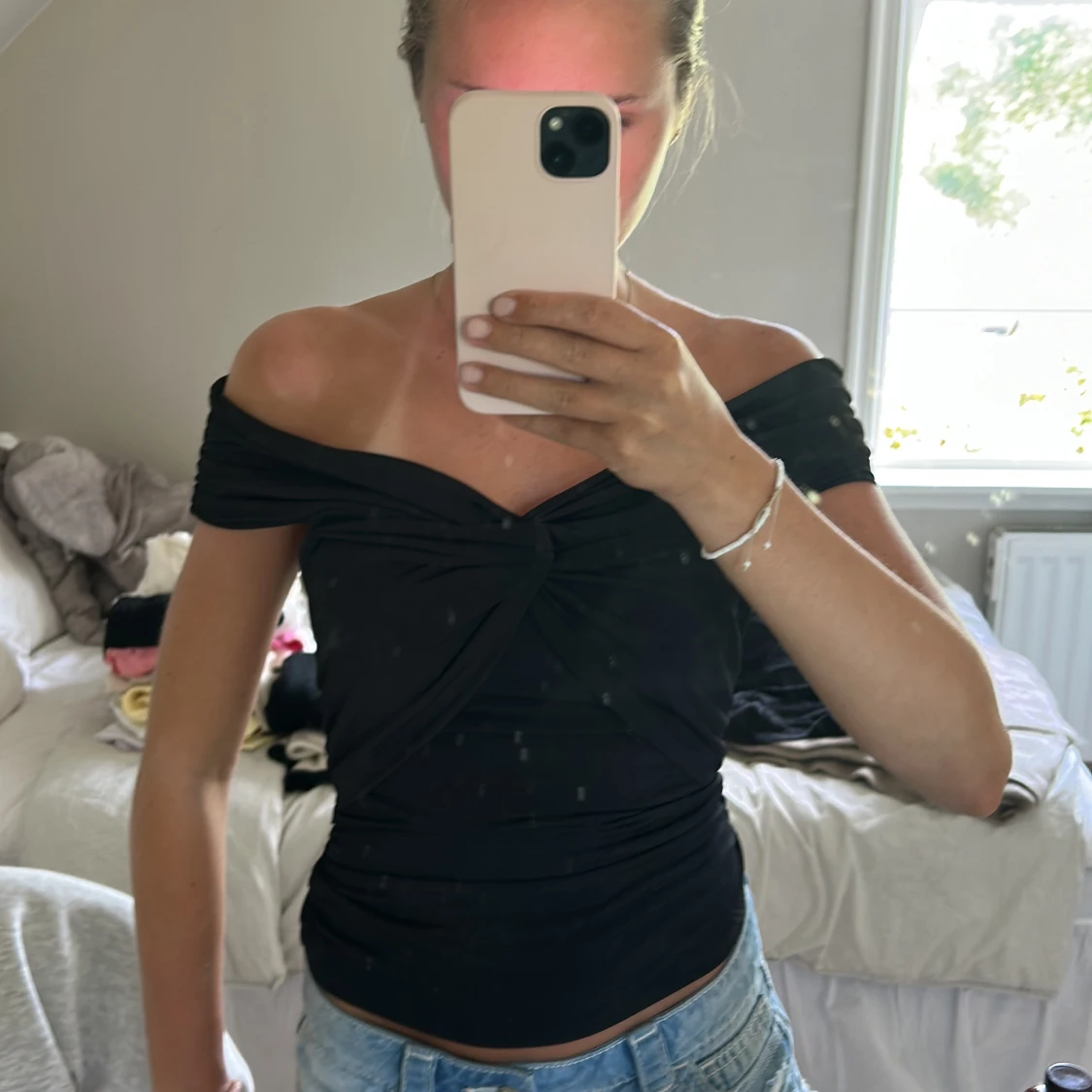 Säljer denna snygga offshoulder topp med twistad detalj framtill. Den sitter tight men har ett stretchigt material😙😙