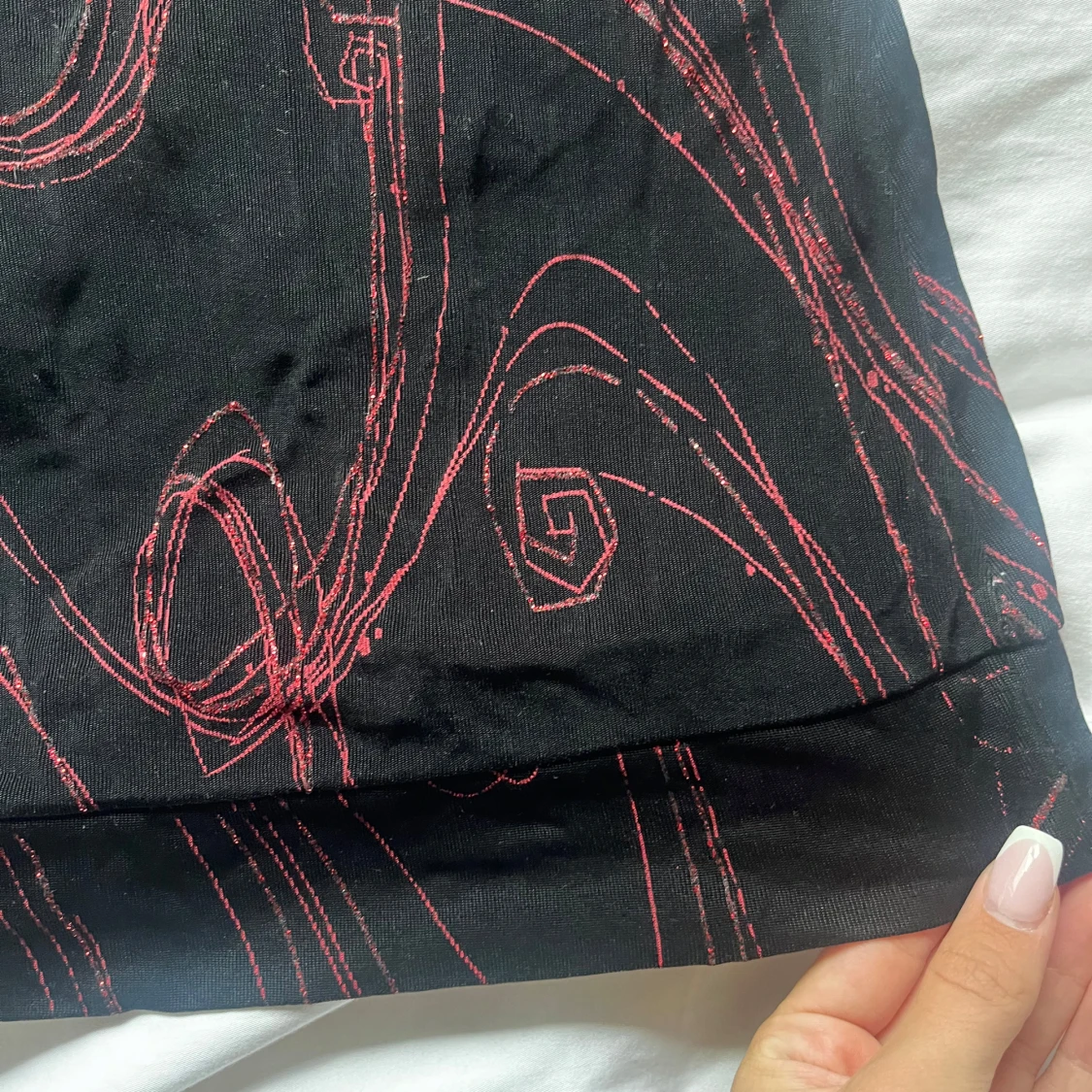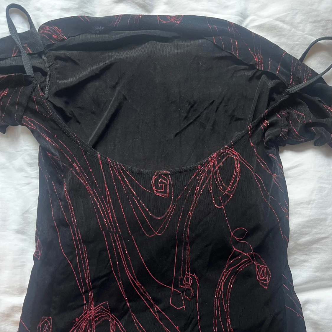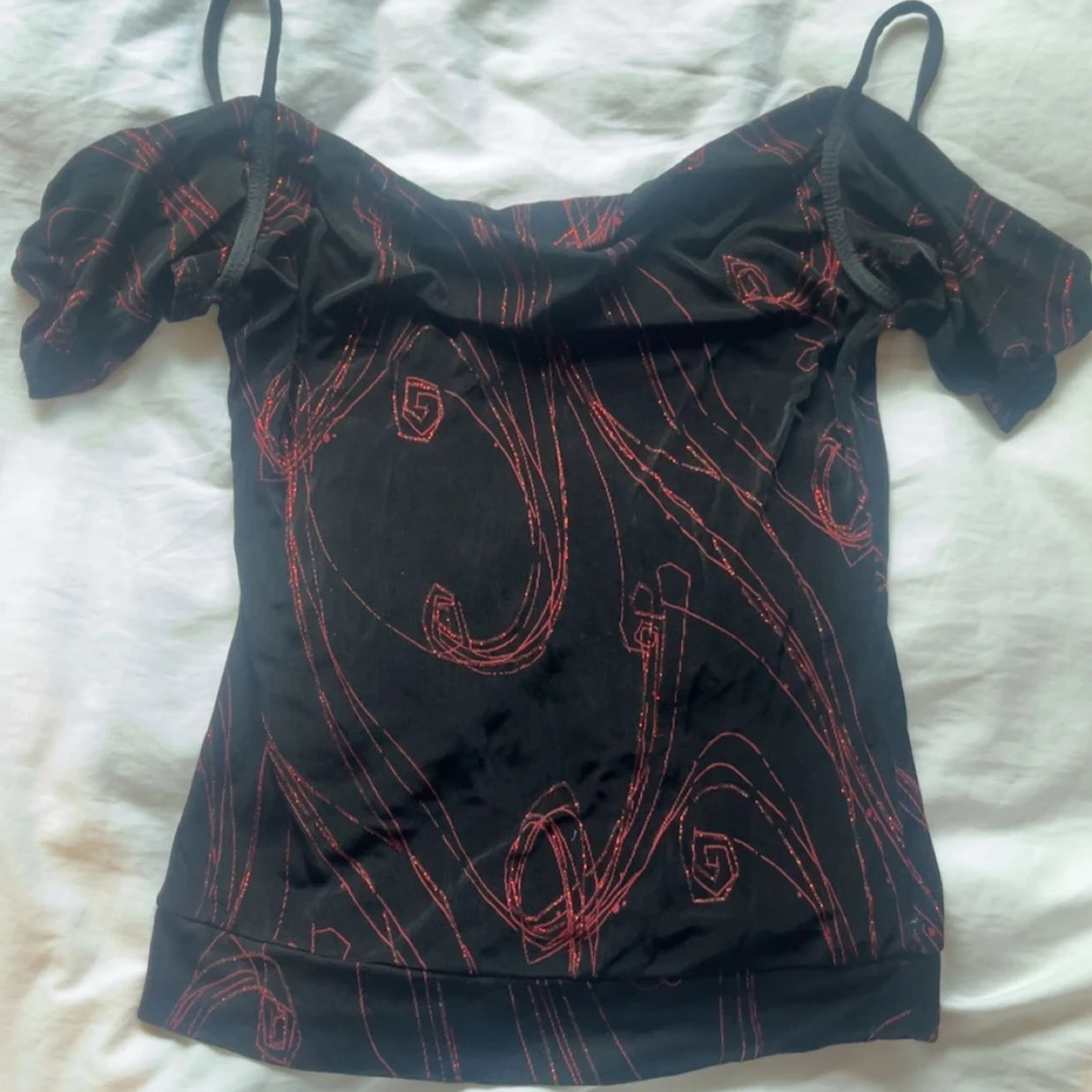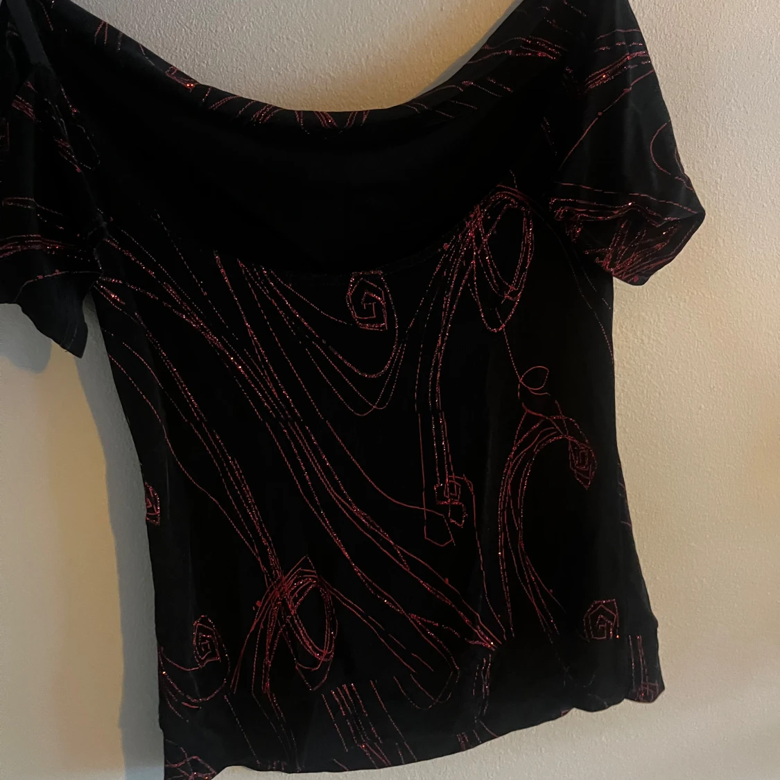 Snygg svart offshoulder topp med smala axelband. Toppen har ett glittrigt rött mönster i virvlande linjer som ger en cool och unik look. Perfekt för fest eller middag med vänner! Tröjan har öppen rygg!