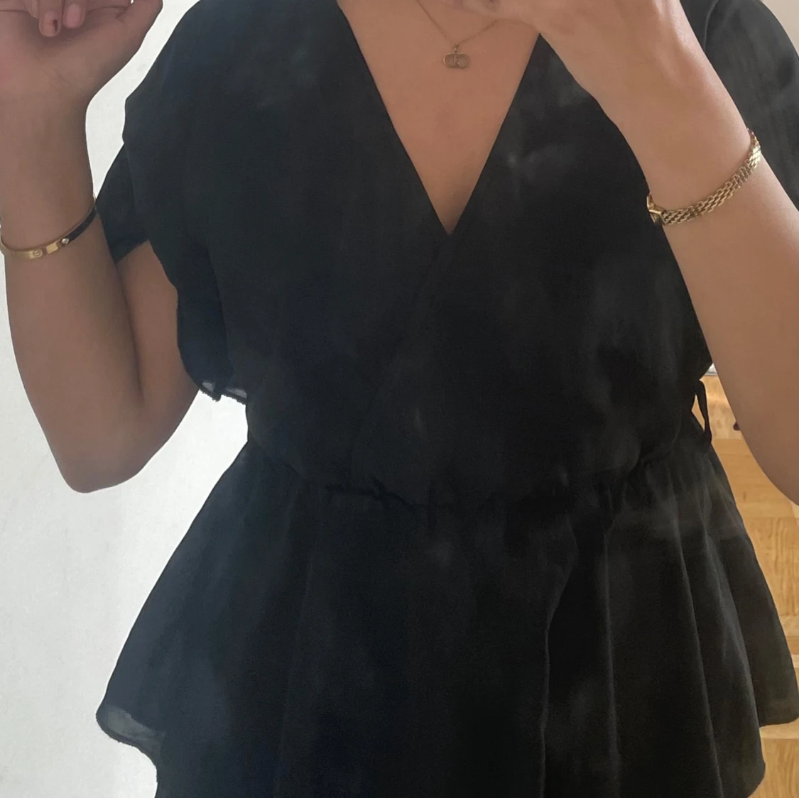 Säljer en svart blus med omlott-design och v-ringning. Toppen har korta ärmar och en volangkant nedtill som ger en snygg siluett. Materialet är lätt och luftigt, perfekt för att skapa en chill och trendig look. Passar dig som gillar stilrena och enkla plagg. Använd 2-3 ggr .