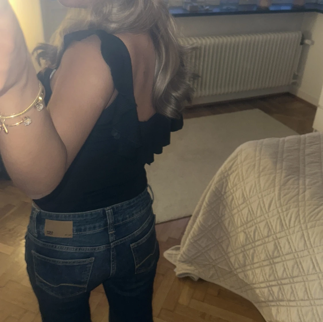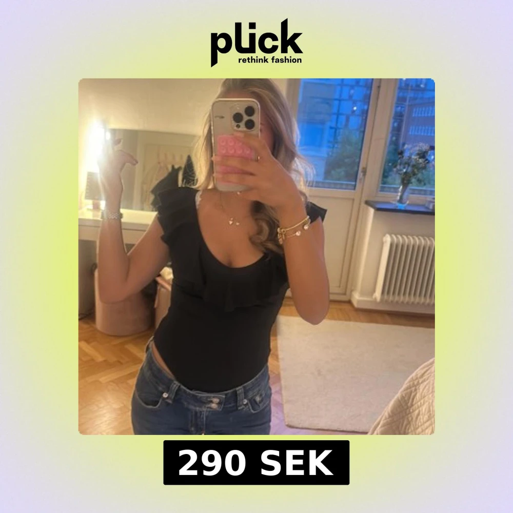 Säljer en svart bodysuit med djup v-ringning och bred volang längs urringningen. Modellen har breda axelband och är åtsittande. Perfekt för dig som vill ha en stilren och trendig topp till jeans eller kjol. PRISET KAN DISKUTERAS🩷🩷
