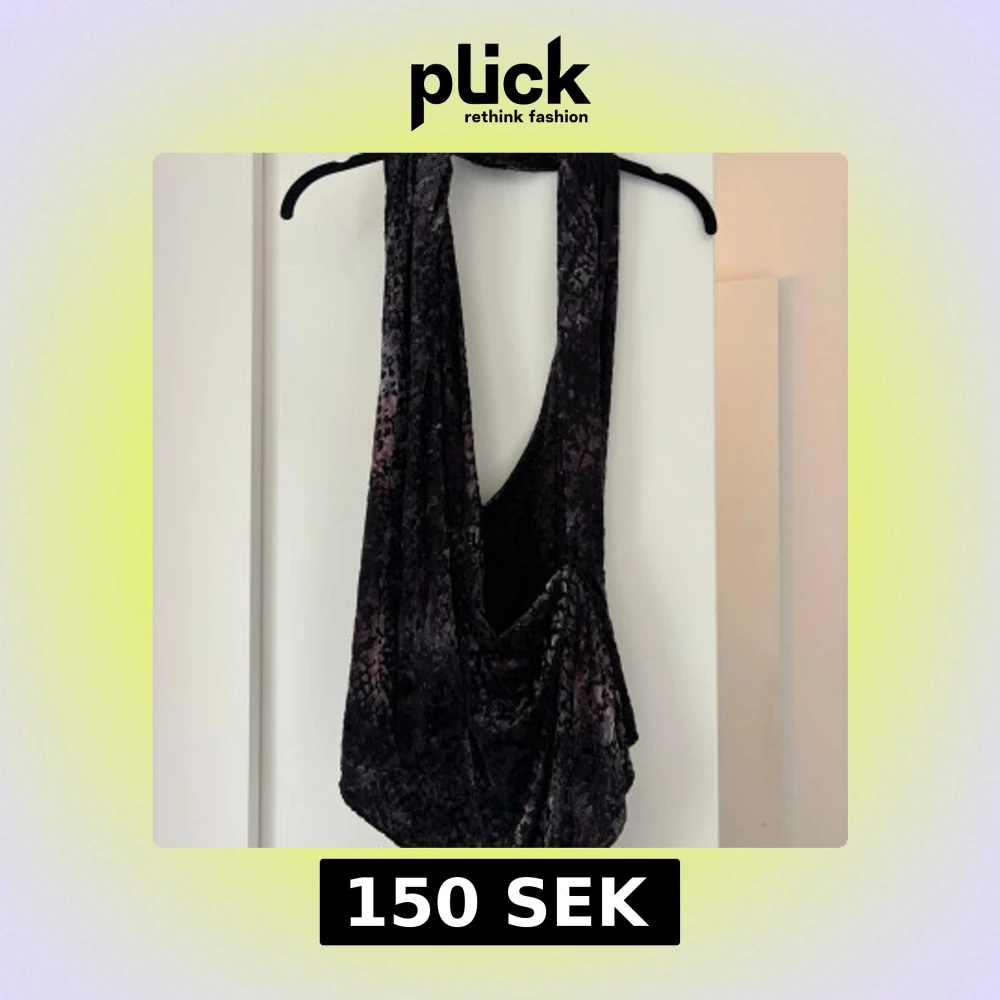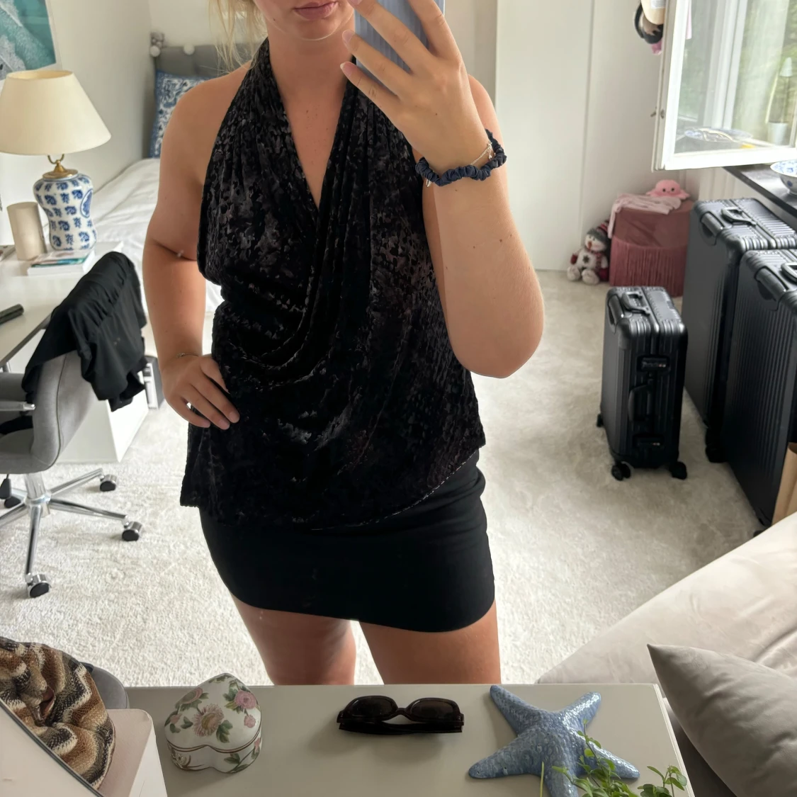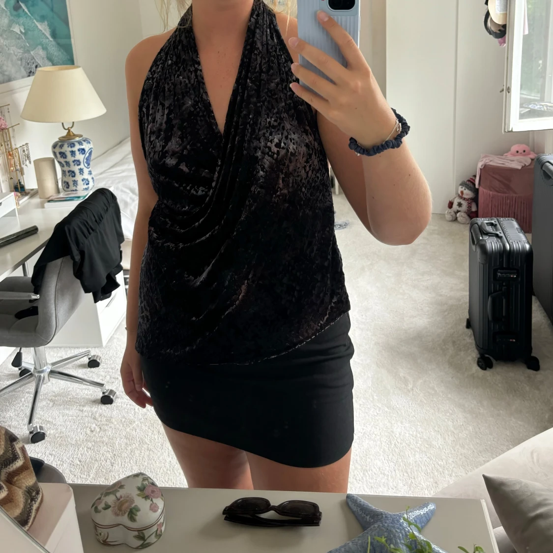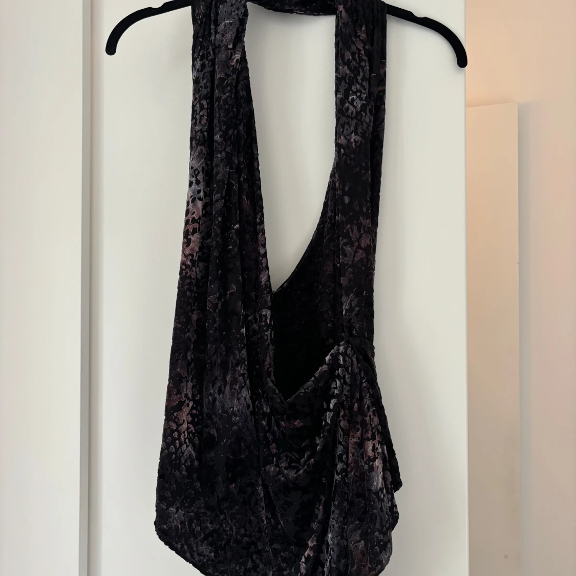 Säljer en svart omlott halterneck topp i mjuk sammet med snygg drapering framtill. Toppen är ärmlös och har öppen rygg som ger en cool och trendig vibe. Perfekt för dig som gillar att sticka ut med en unik och lyxig look.
