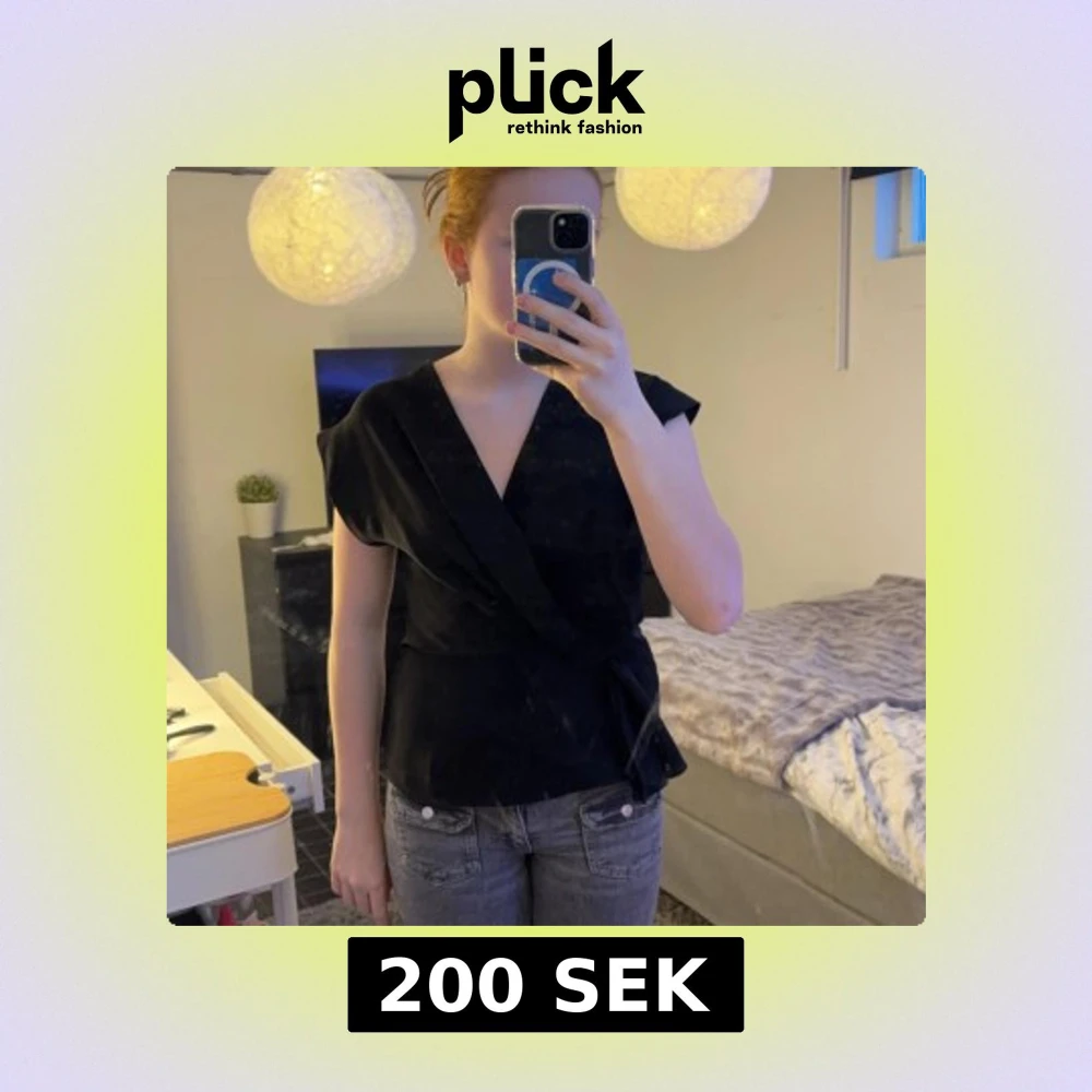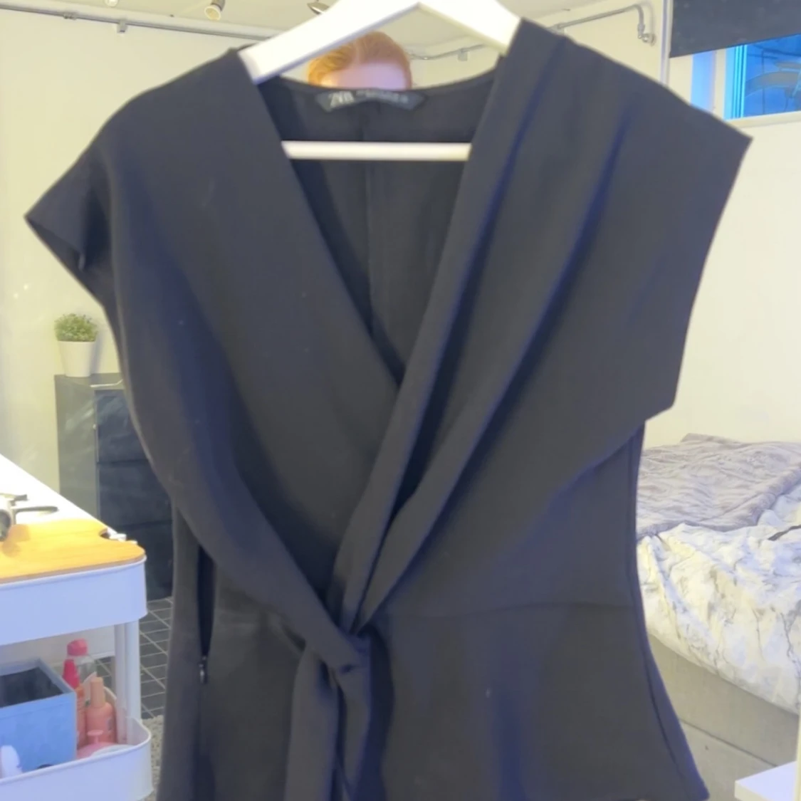 Snygg svart omlottblus från Zara med knytning i midjan. Blusen har en v-ringad design och korta ärmar, perfekt för en stilren look.